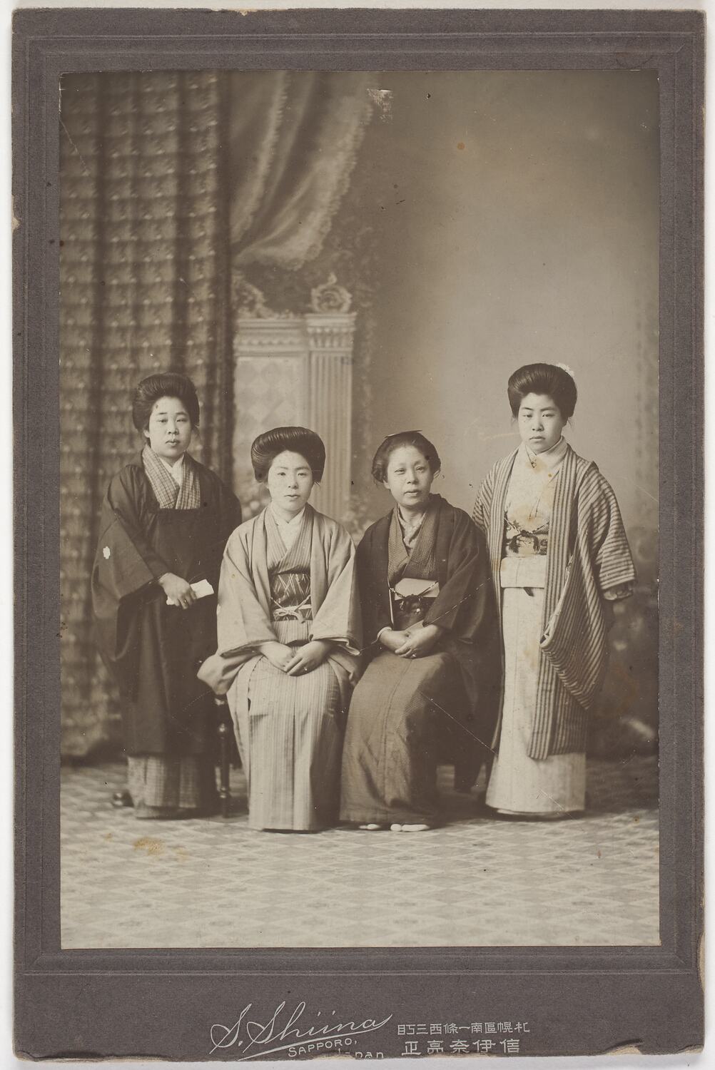 Studio portrait of four female members of Setsutaro Hasegawa's family. The two women in the middle are sitting down while the two women on the outside stand. They are all wearing traditional dress.