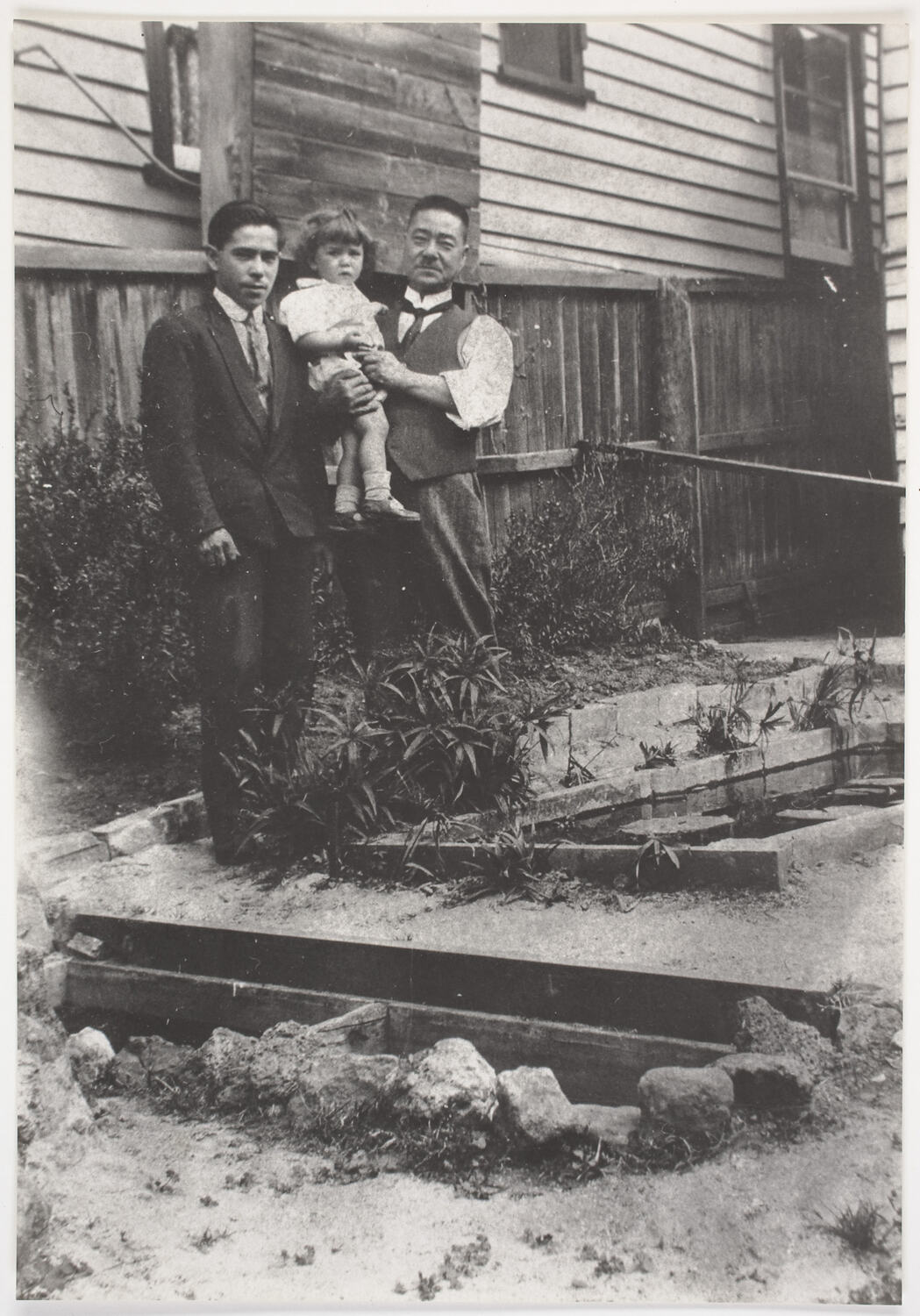 Setsutaro Hasegawa (right) with his son Leo (left) and grandchild Leonard (middle), in his backyard at Little Ryrie Street, Geelong, Australia. Based on the age of the child and date Leo married, the photograph is assumed to have been taken circa 1935.