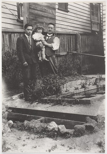 Digital photograph of Setsutaro Hasegawa, his son Leo, and one of his grandchildren, Leonard (Leo's son) in his backyard at Little Ryrie Street, Geelong, Australia, circa 1933.