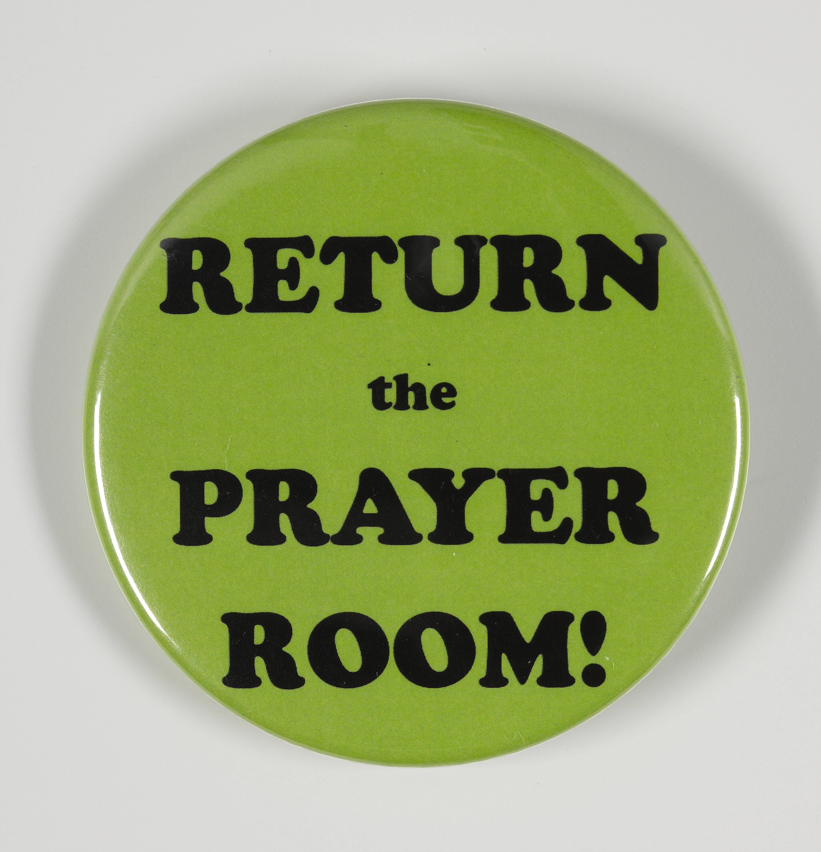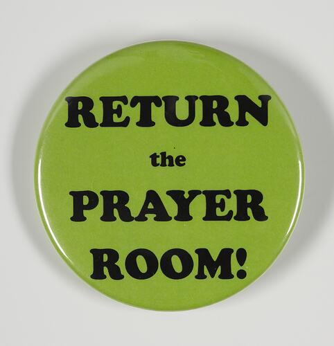 Badge with the slogan 'Return the Prayer Room'. It was collected on 12 July 2009 during the Walk for Harmony event in Melbourne. The 2009 Walk for Harmony was led by Labour Premier John Brumby to reaffirm Victoria's support for multiculturalism. This initiative was developed in response to Indian student protests in Sydney and Melbourne at the end of May and beginning of June 2009. With 5,000 participants, the Walk for Harmony began at Carlton Gardens at 1pm, continued along Latrobe and Swanston streets in Melbourne's CBD, and culminated at Federation Square with a free half an hour concert.