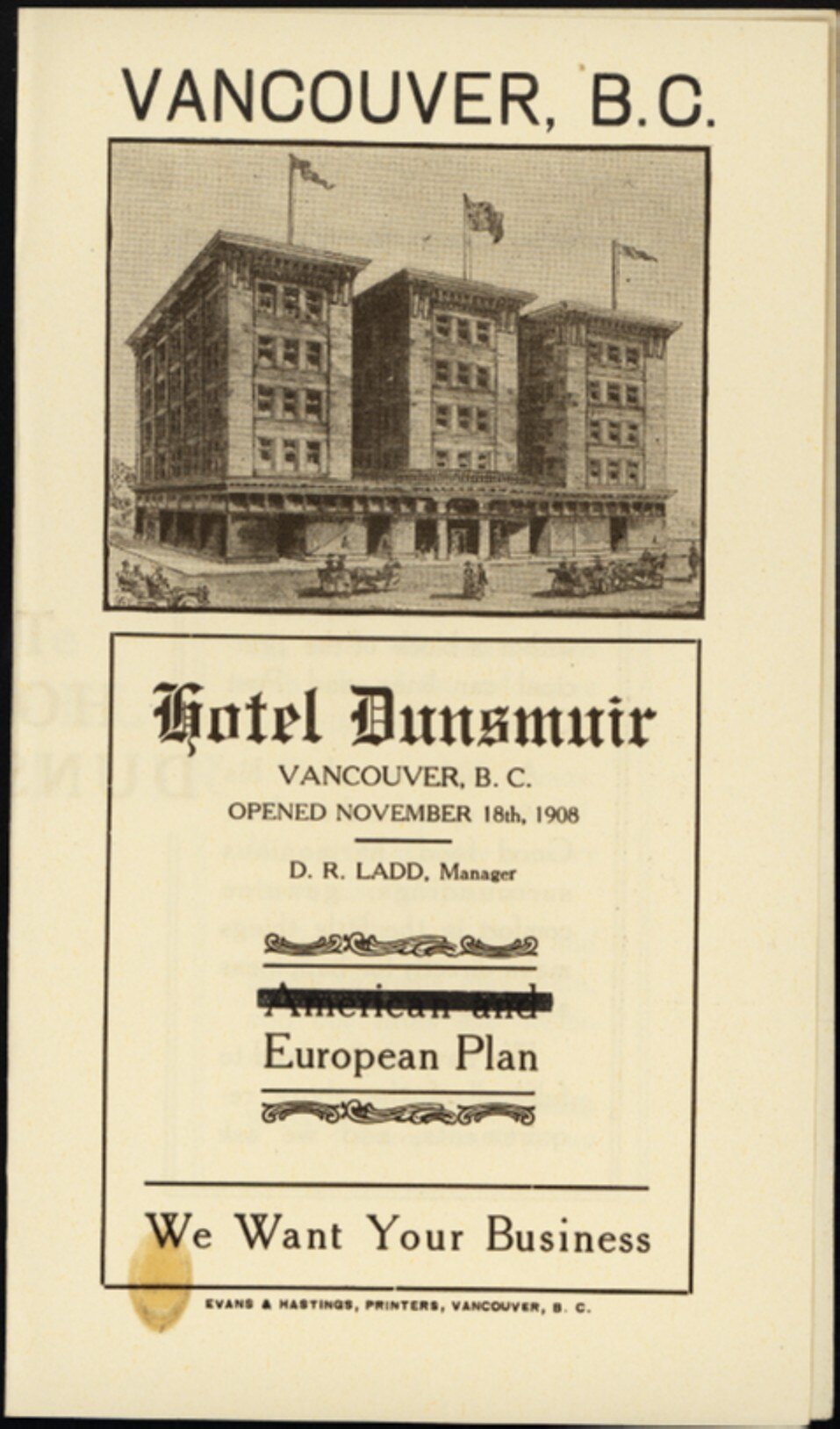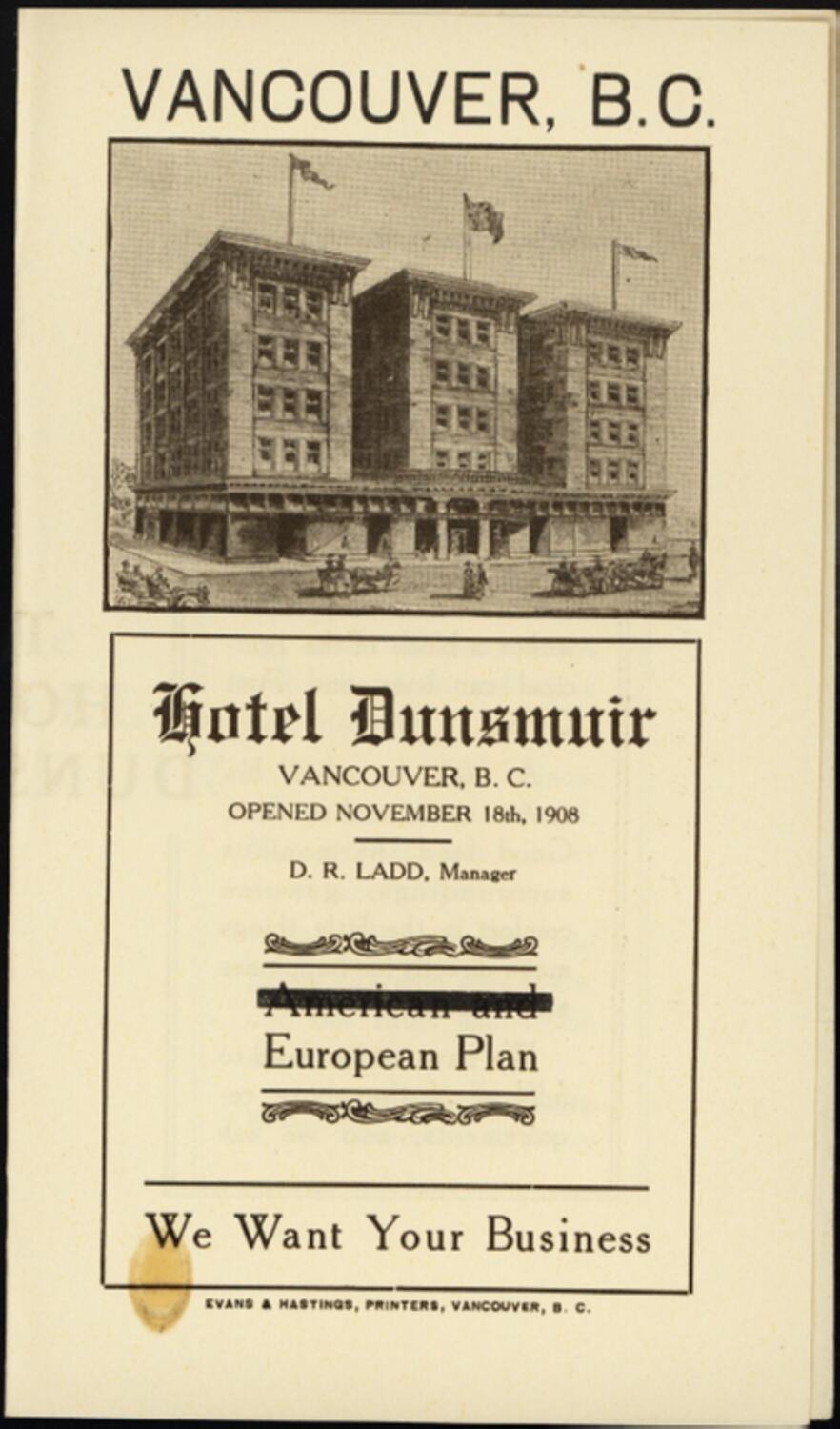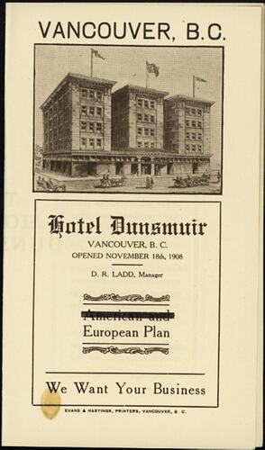 Text: VANCOUVER, B.C. / Hotel Dunsmuir / VANCOUVER, B.C. / OPENED NOVEMBER 18th, 1908 / D.R. LADD, Manager / European Plan / We Want Your Business.