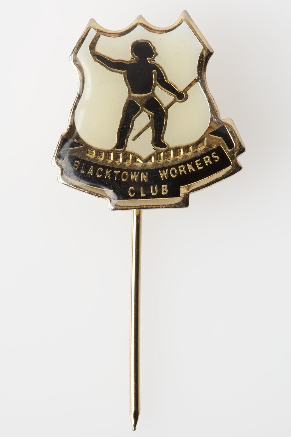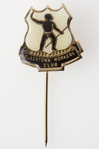 Metal pin depicting a black Aboriginal male figure in the centre, holding his left arm above his head, as if to throw a boomerang. This iconography is the current logo of Blacktown Workers Club and can still be seen at the entrance of the club.