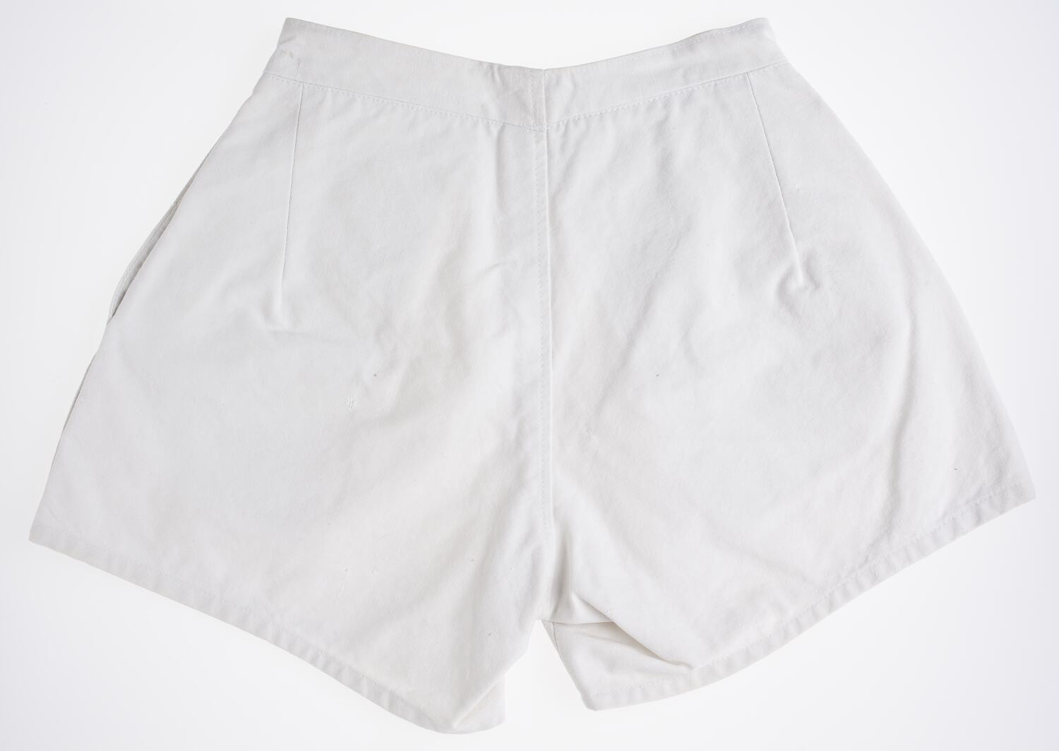 Pair of white canvas female shorts, featuring two slit side pockets and two pleats at front. There are four cream plastic buttons down left hand side of the shorts. There are two darts at the back and the shorts are fully hemmed.