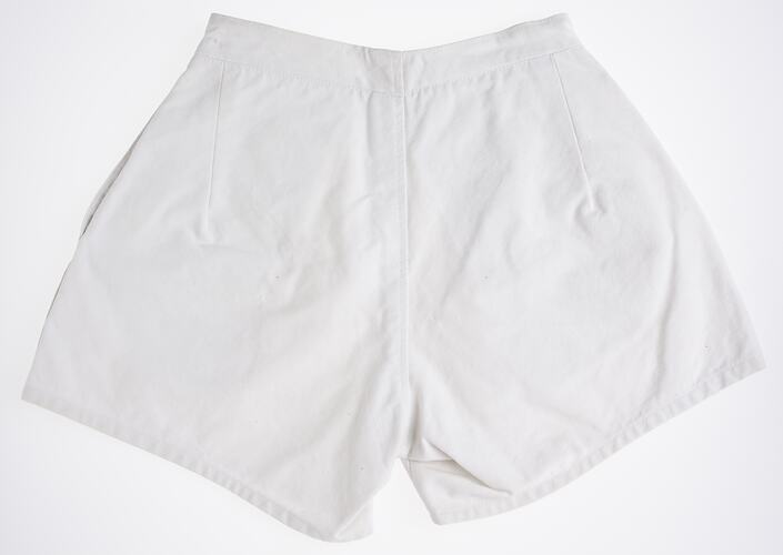 Pair of white canvas shorts made for Dimka Stojkovic in a Displaced Persons Camp in Kassel, West Germany, circa 1947. The shorts were made from the military tents used in the camp. She also wore these shorts during her during her journey to Melbourne, and her Australian born daughter, Nada Stojkovic, also wore these shorts while living in Melbourne.