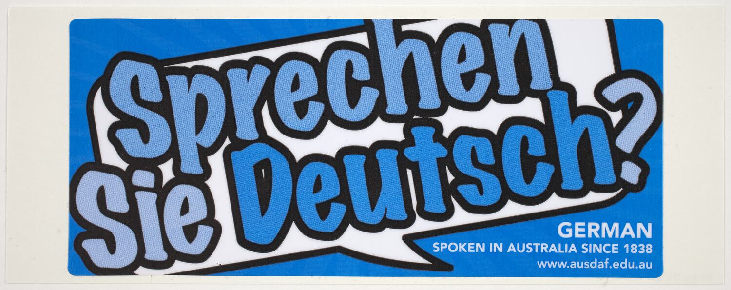 Promotional sticker posing the question 'Sprechen Sie Deutsch?' (Do you speak German?). Germans are one of largest ethnic groups in Victoria with 28,123 German born people counted in the 2006 census. Many still speak German at home and the sticker notes the longevity of German as a language in Australia - having been spoken here since 1838.