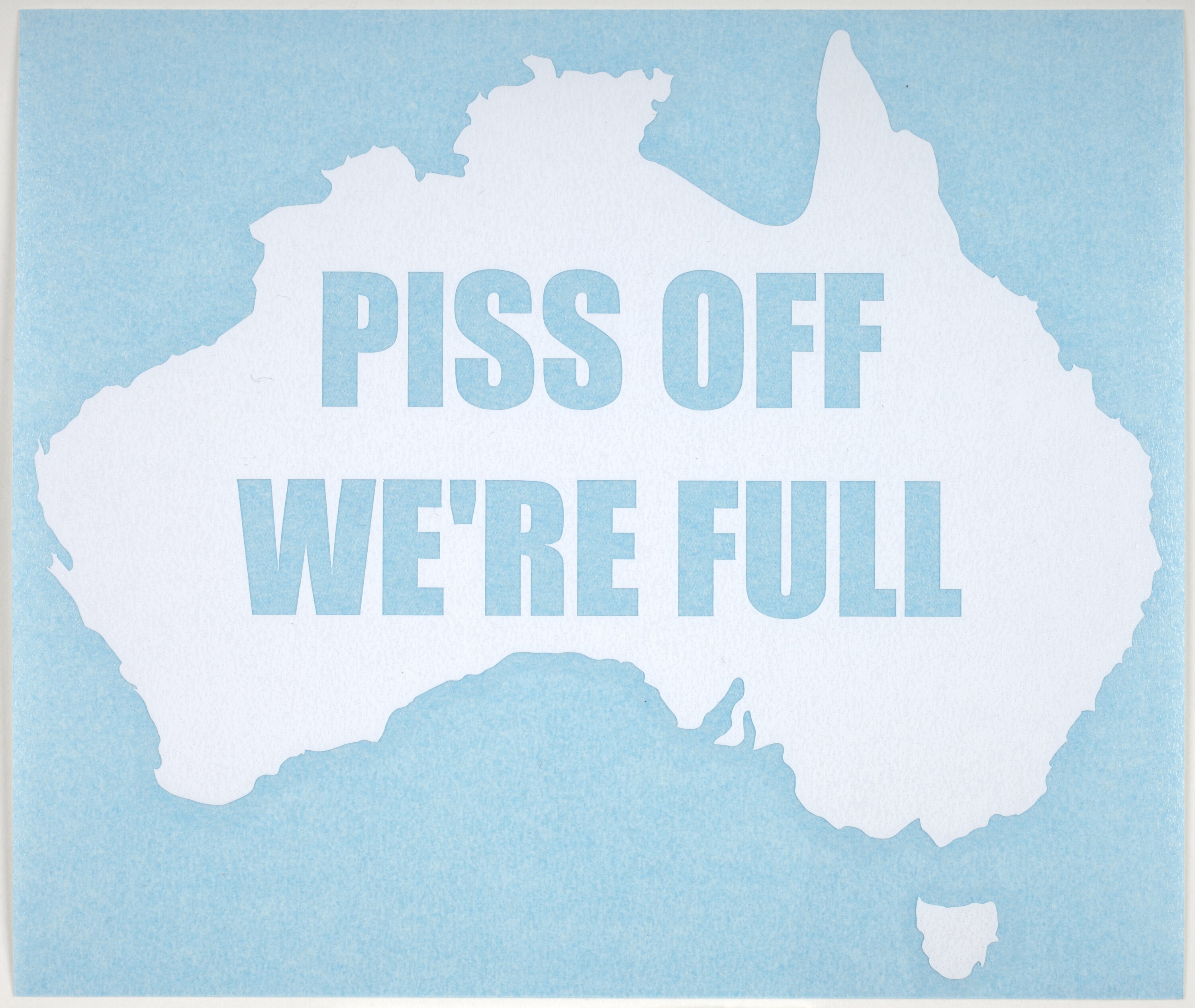 The stickers displaying the outline map of Australia with "Piss Off We're Full!" and "Bugger Off We're Full" in the centre is a continuation of Australian fears of being 'swamped' by foreigners. The image of a white map of Australia and its variations appear scrawled on white human skin and t-shirts at the Cronulla riots in December 2005 and on Australia Day celebrations and disturbances, including that on Manly Beach on 26 January 2009. The use of the white map of Australia iconography, formerly a common feature of medals, badges and stamps, is an echo of the 'White Australia' policy of the early 20th century.