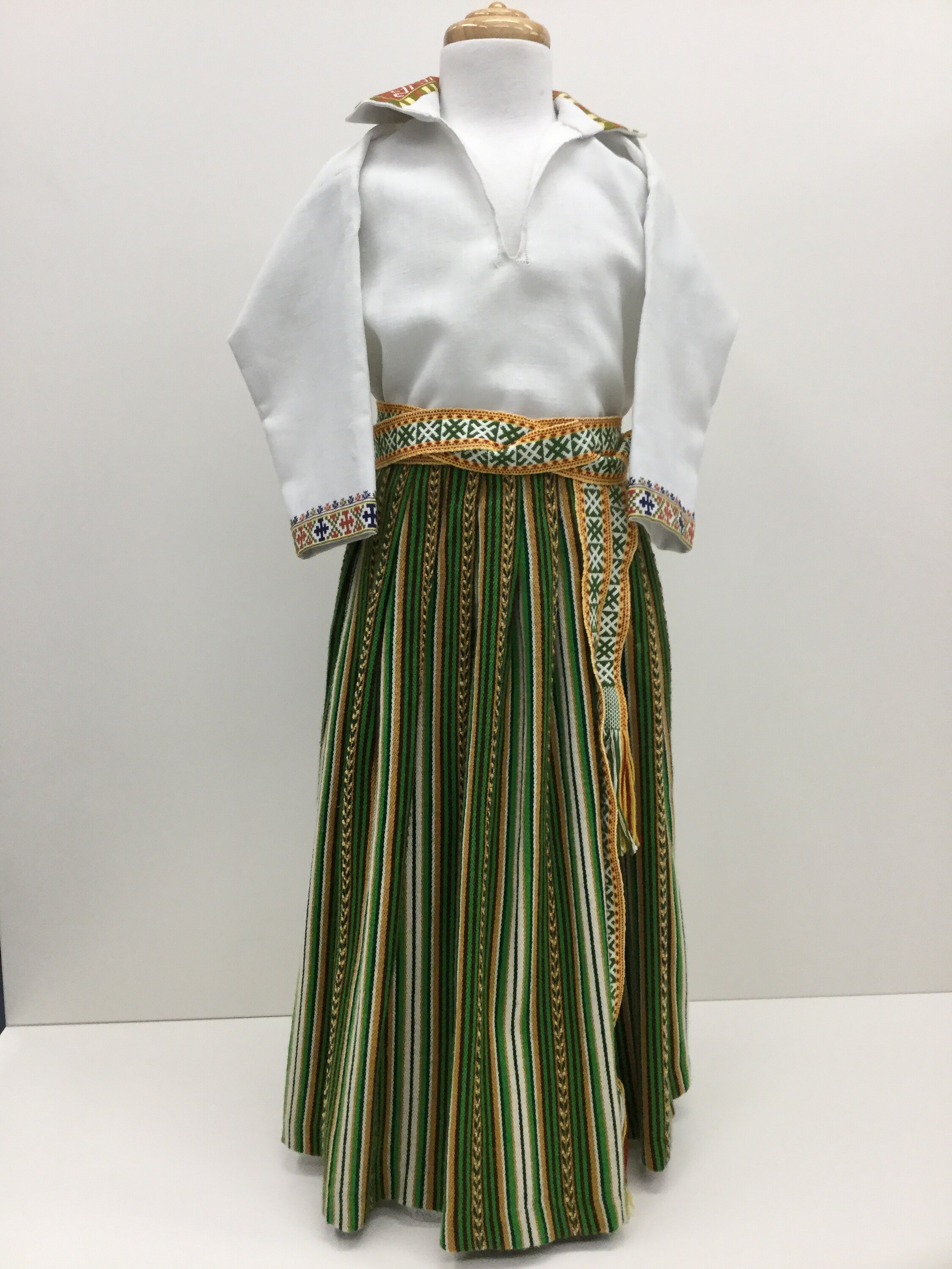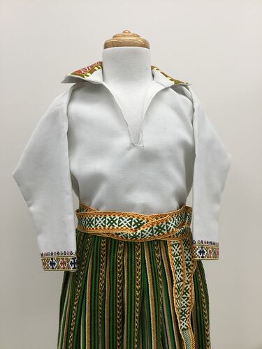 Child's shirt which forms part of a Latvian national costume which uses traditional patterns from the Dignaja Region. It was made by Mrs Sidorenko in Melbourne in the 1980s for Kaja Herman, the daughter of Anita Apinis and grandaughter of Anna Apinis. The entire costume includes a skirt, shirt, belt and crown, and each piece was made by a different Latvian woman. Anita is second generation Latvian weaver, she was taught by her mother Anna and then undertook further training at the Melbourne College of Textiles.