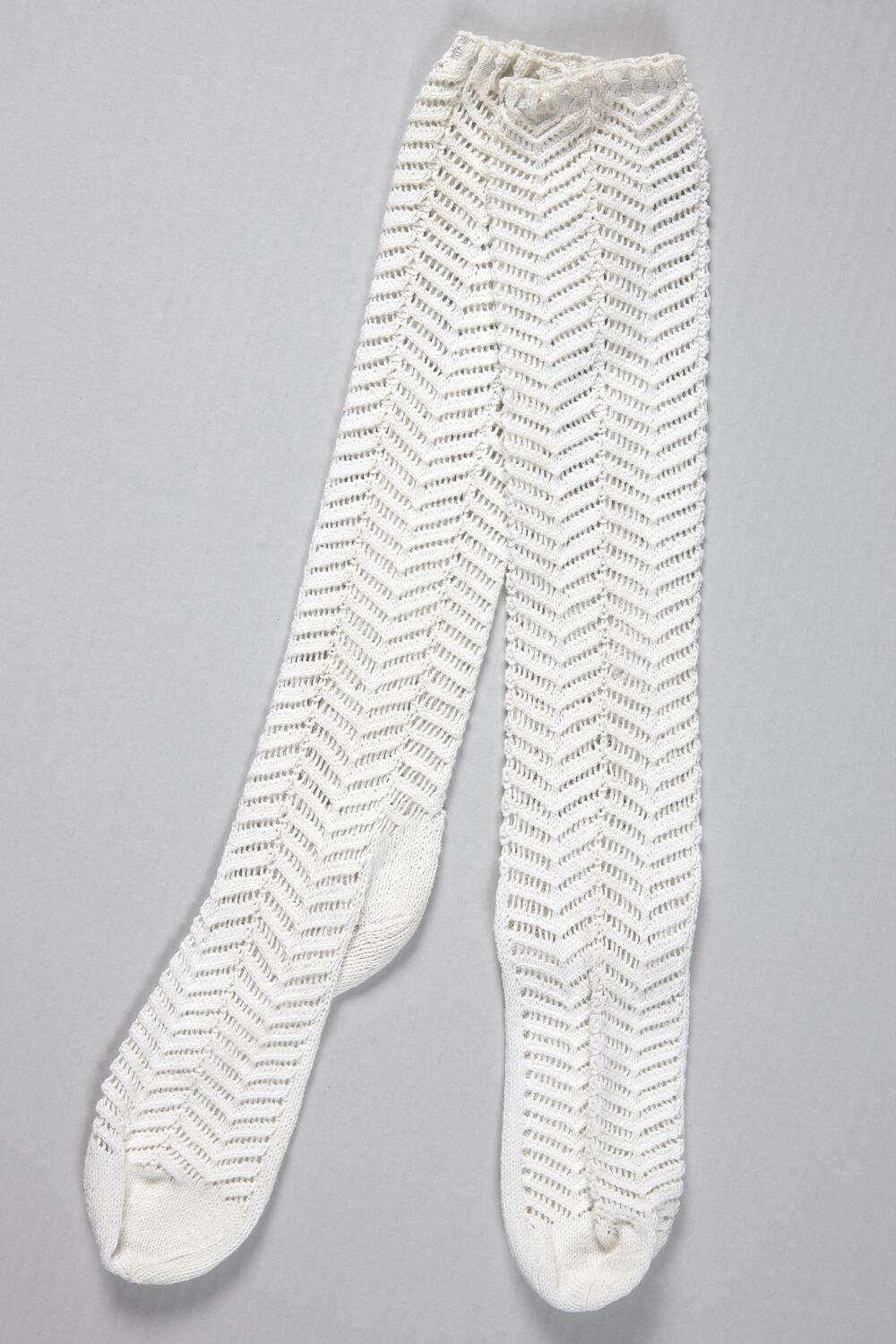 Pair of cream knitted knee length socks, lace knit design with pearl knitted under sole. Tops elasticised.