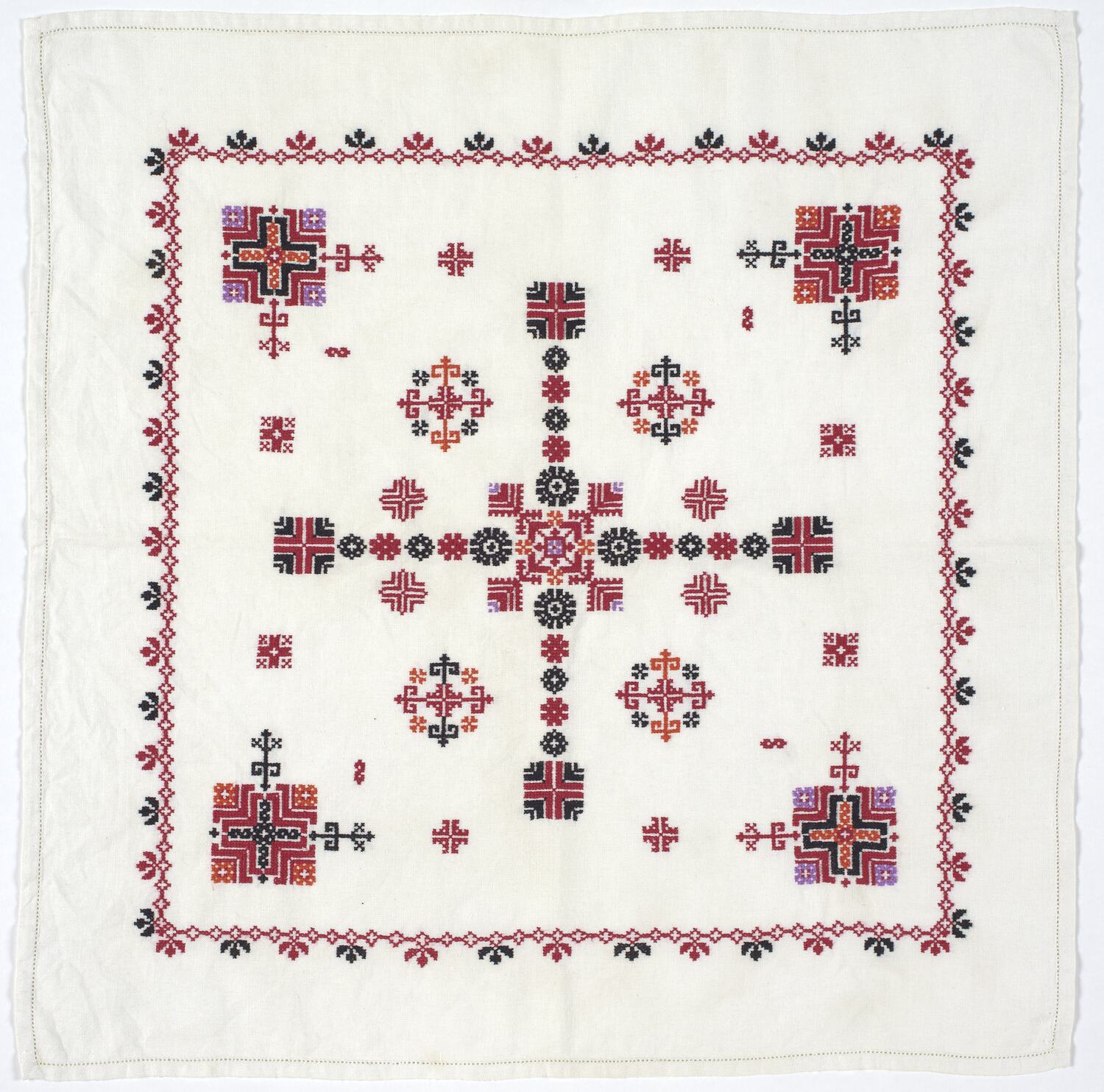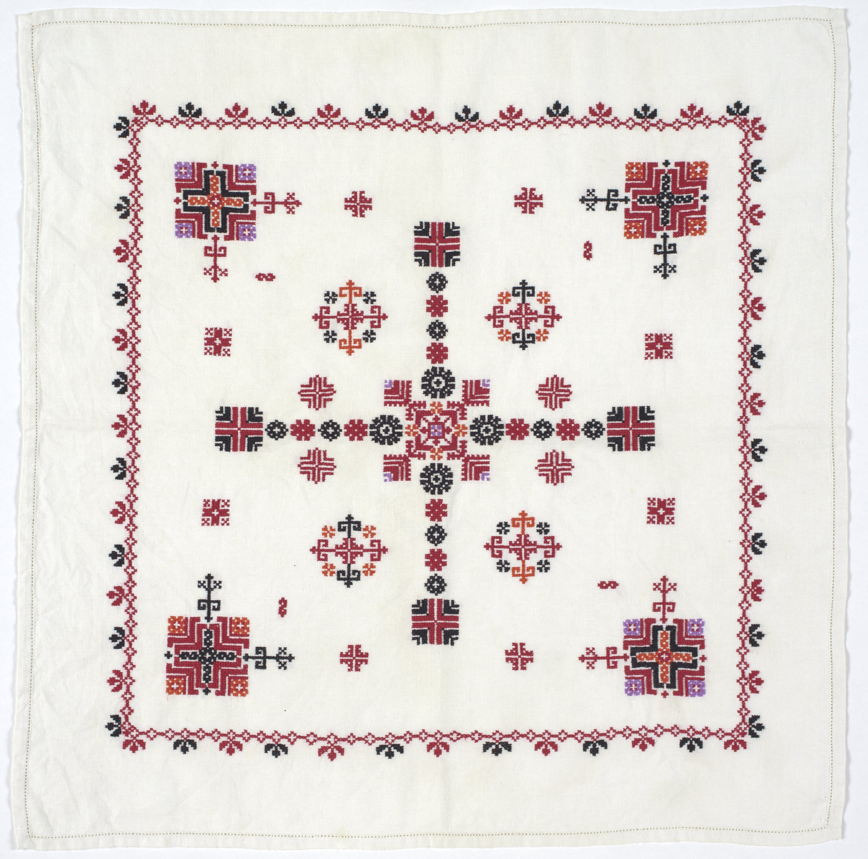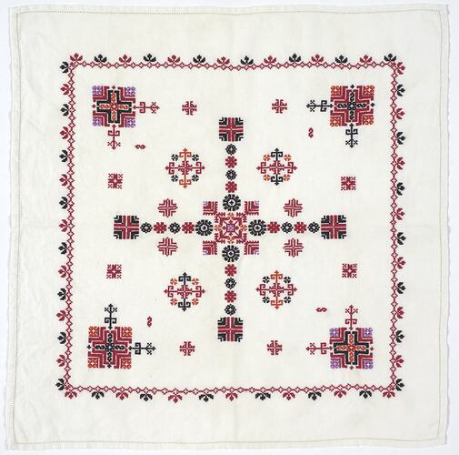 Square cream linen handkerchief with red, black, orange and purple embroidered design. Red and black embroidered inner border with cross and snowflake patterns within the square. Pulled thread border.