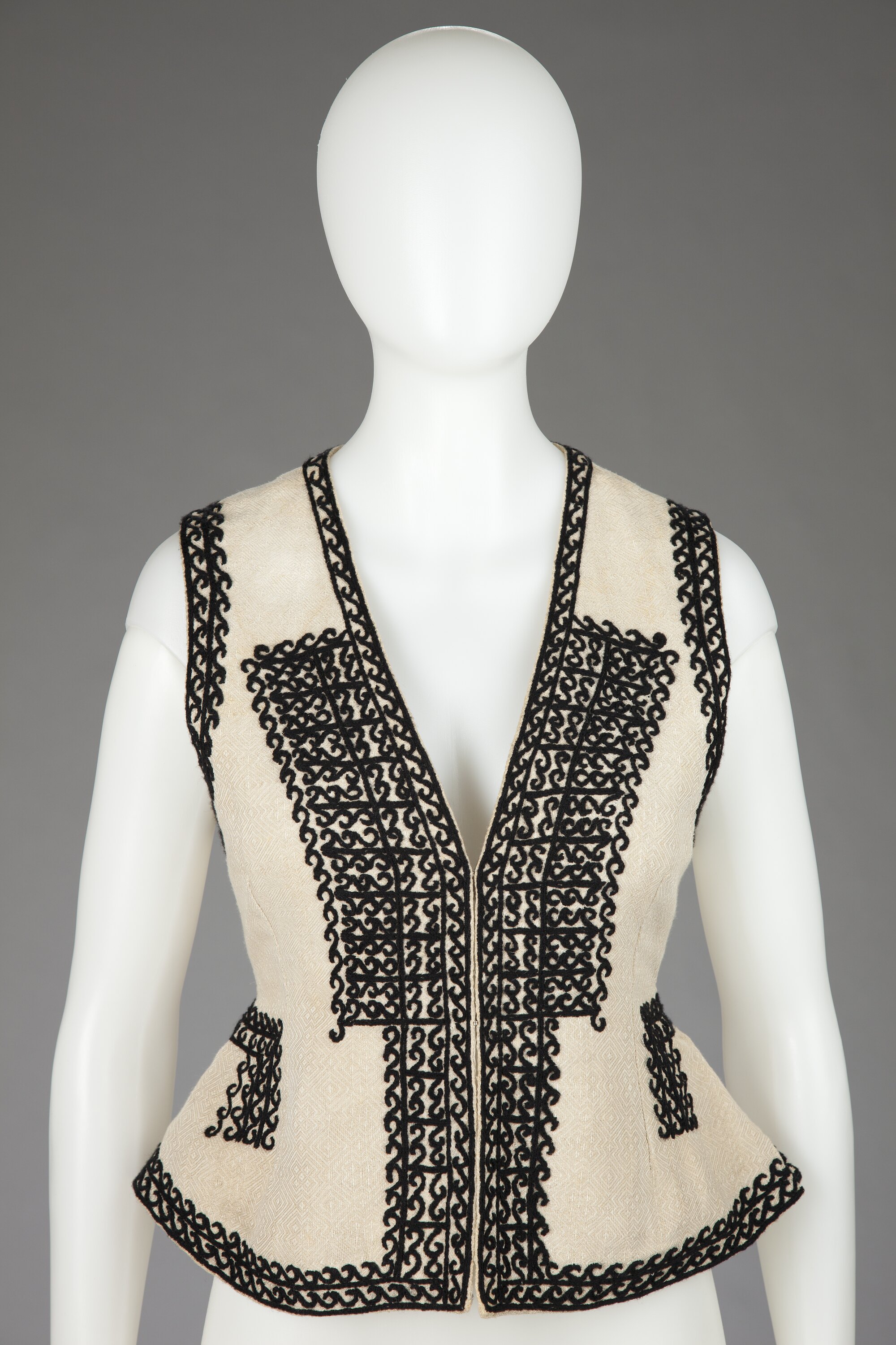 Fine woven cream vest with inner lining. Front panels fastened with four hooks and eyes. Black wool embroidered detailing along neckline, armholes and bottom edging.
