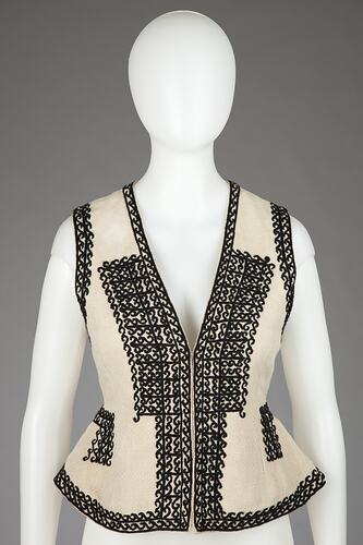 Cream and black vest with traditional Latvian patterns from the Nica Region. It is part of a whole costume which includes a handkerchief, socks and shirt. It was woven by Anna Apinis in Sydney in the 1960s. Anna was born in 1913 in Latvia. She attended weaving lessons in Liepaja in Latvia from 1930 to 1933 and spent hours at the nearby Liepaja Ethnographic Museum, recording traditional fabric designs in her notebooks. She had a loom constructed for her by fellow survivors of the World War II in at Memmingen a displaced persons camp in Germany.