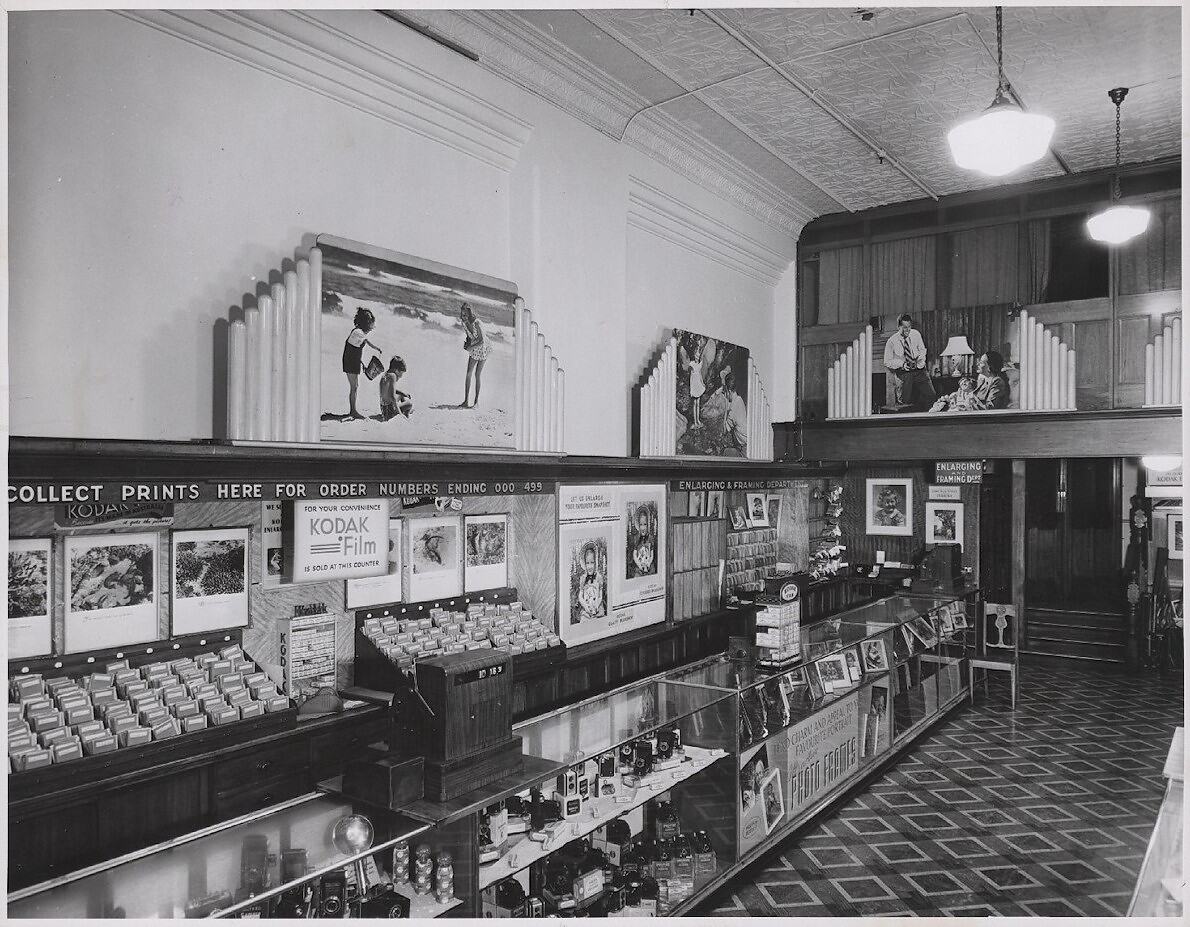 Shop interior showing display cabinets of cameras and photographic equipment with glass service counter running the length of the wall.