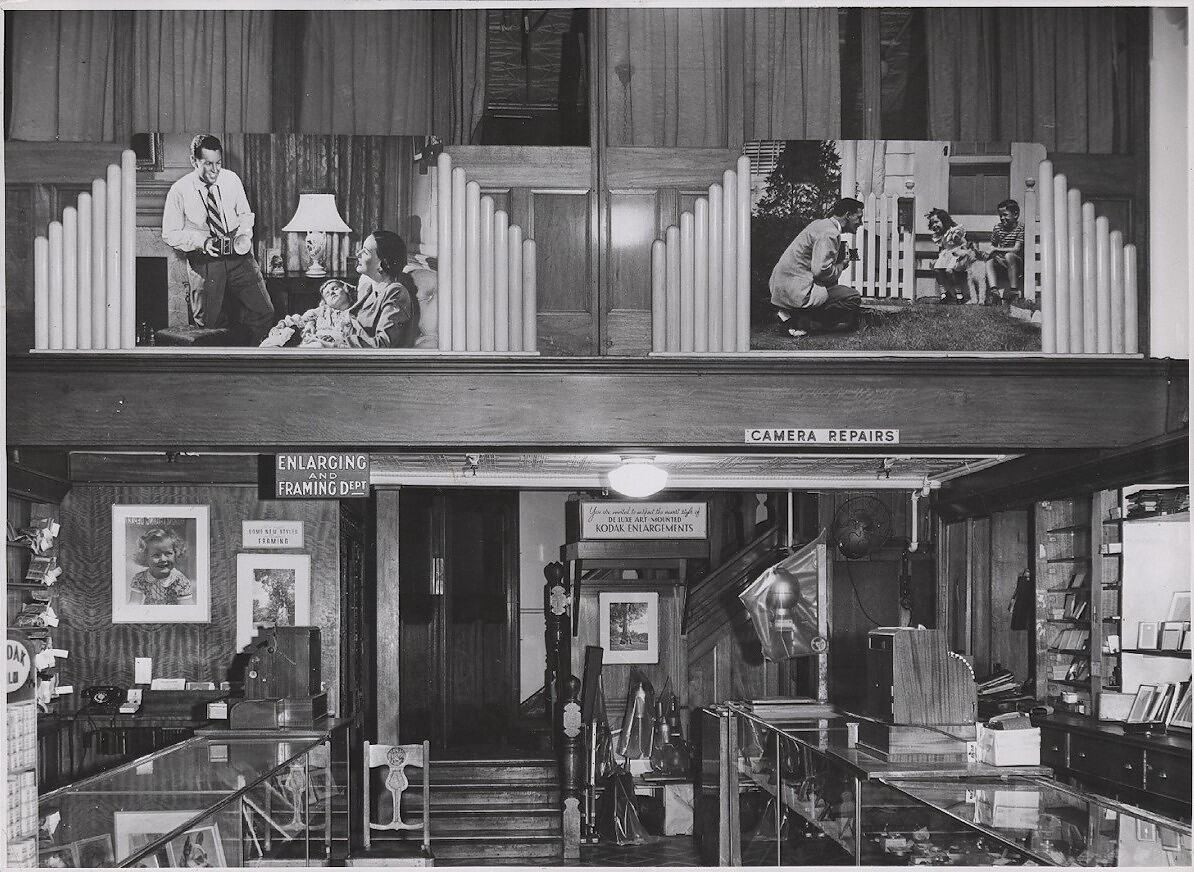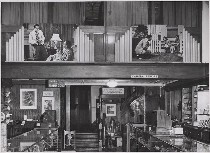 Shop interior showing display cabinets of cameras and photographic equipment. Timber panelled walls and timber staircase.
