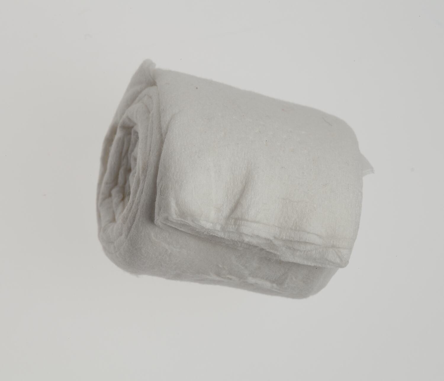 Part 3 of a series of 16 steps in making a Shimotsuke doll. Part three is comprised of a piece of white tissue paper in the plastic bag in which it is contained and numbered, in accordance with the sequence of production. Piece of tissue is rolled into a cylindrical shape to from the beginning of the head of a doll.