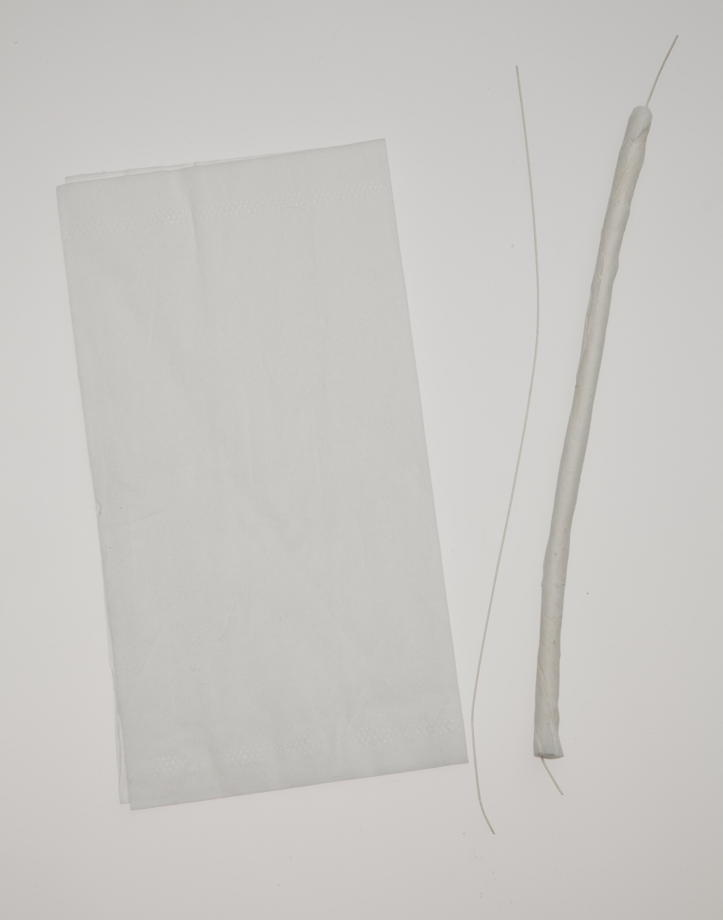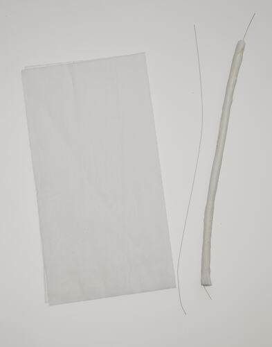 Part 7 of a series of 16 steps in making a Shimotsuke doll. Part seven is comprised of pieces of white tissue paper and cotton string in the plastic bag in which it is contained and numbered, in accordance with the sequence of production. One piece is rolled over the cotton string.