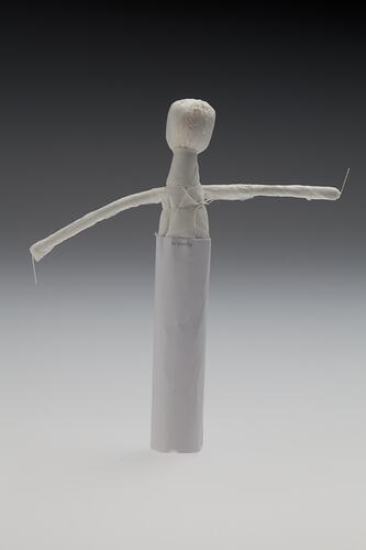 Part 9 of a series of 16 steps in making a Shimotsuke doll. Part nine is comprised of a partially made figure from pieces of white tissue paper, paper and string. A cylindrical piece of cardboard forms a skirt and stiff paper arms jut out horizontally.