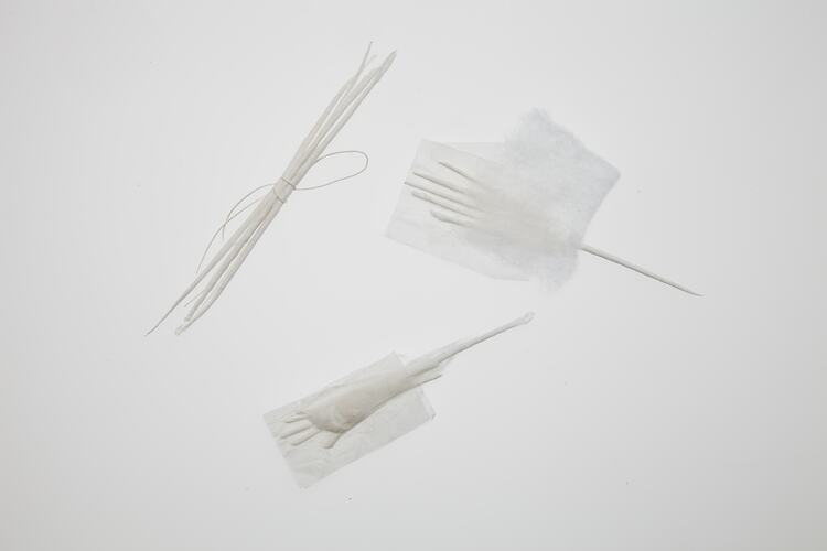 Part 13 of a series of 16 steps in making a Shimotsuke doll. Part thirteen is comprised of two partially made hands and extra sticks wraped in paper and extra cotton wool in the plastic bag in which it is contained and numbered, in accordance with the sequence of production.