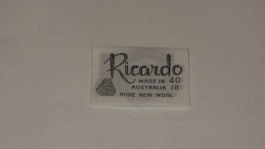 Garment label produced for Ricardo Knitwear, a Melbourne firm that specialised in expensive, classic knitwear for men and women. The company was based in Johnston Street, Collingwood and operated from 1958 to 1978. It was founded by Richard Charlupski, a Polish migrant who arrived in Australia in 1950.