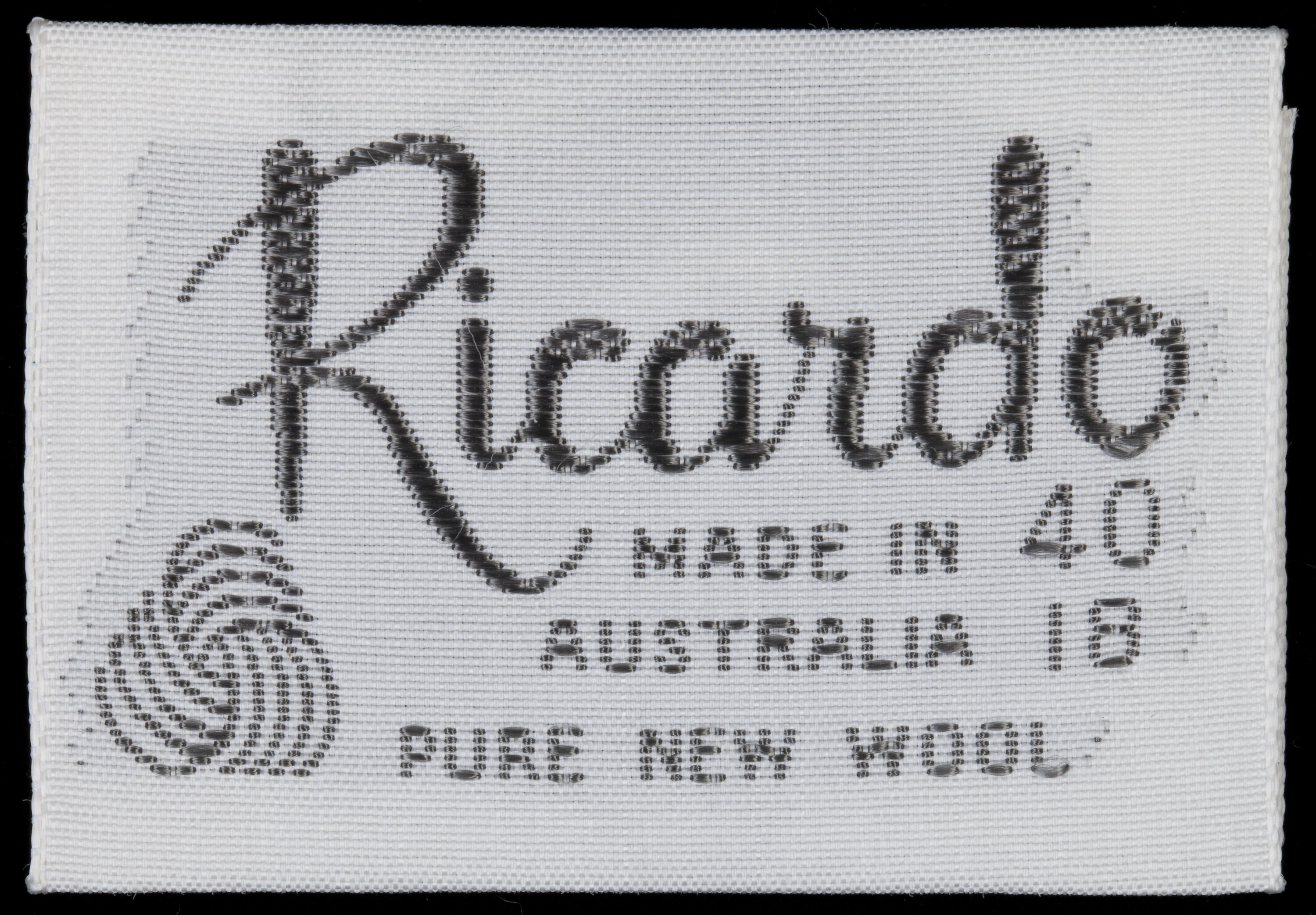 Woven white fabric rectangular label with dark grey embroidered text on obverse and reverse. The front features the wool mark logo.