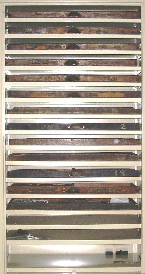 Thirteen cases (technical name for drawer) containing printing type. The thriteen cases are stored with each other in a museum container. The container is not a purpose built printing type cabinet as are most of the other Cabinets.