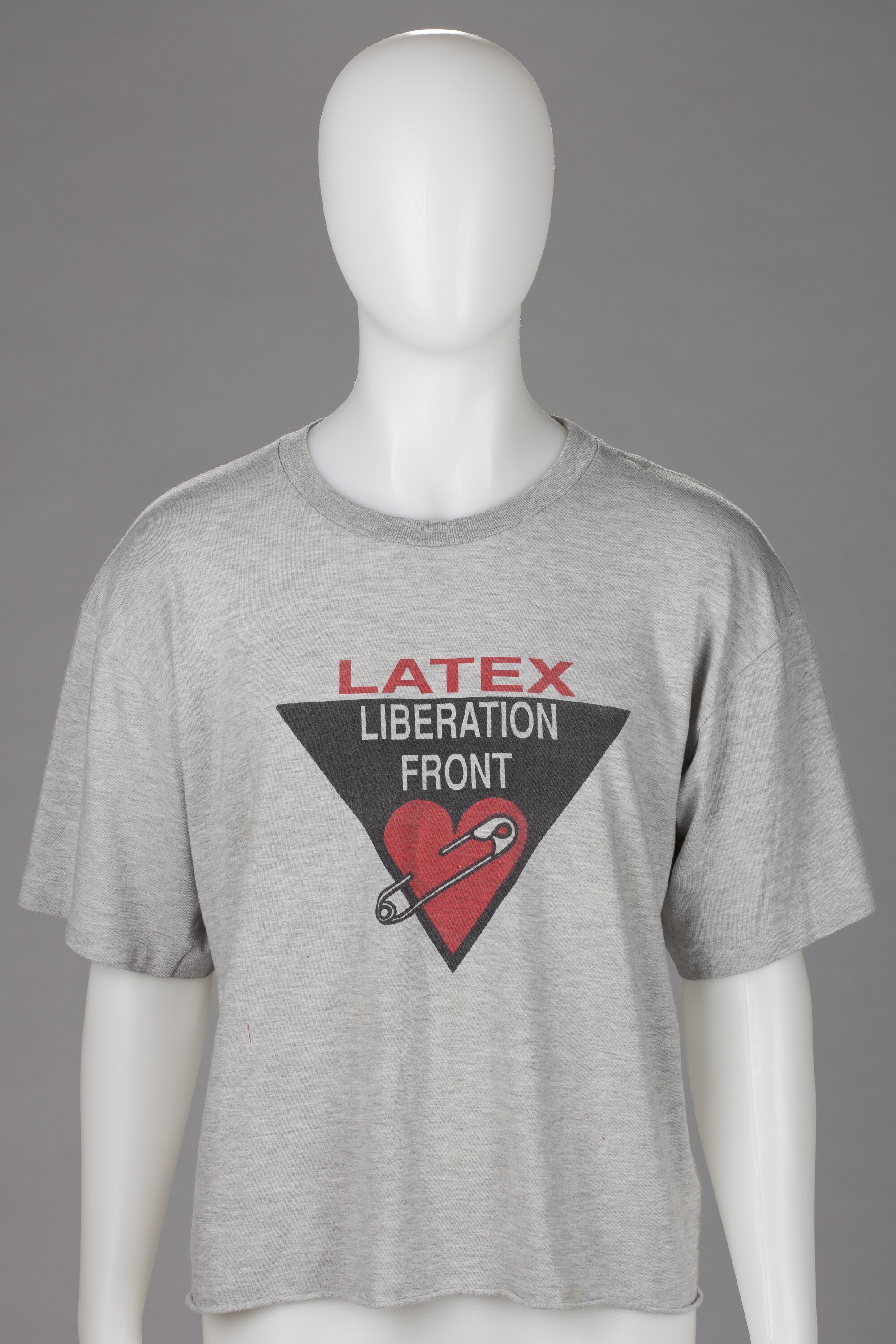 Grey polyester cotton t-shirt, printed on front with black triangle with heart, pinned with safety pin. Printed on front: 'LATEX LIBERATION FRONT'