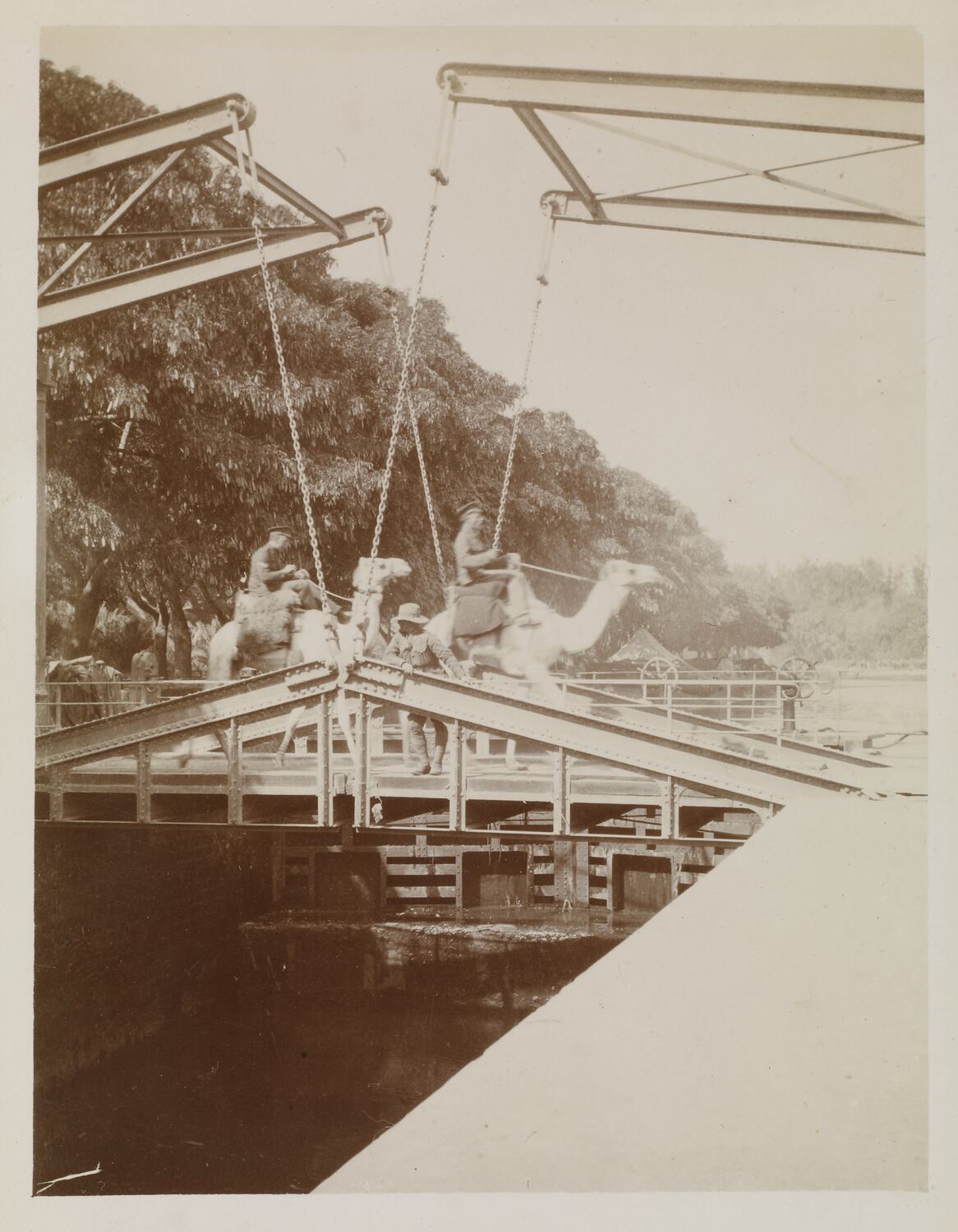 The photograph shows two Australian soldiers on camels crossing a small bridge over the Sweet Water Canal. Another soldier stands, leaning on the bridge, in front of the camels and their riders. Chains connecting the base of the bridge to a metal structure suspended above the bridge indicate it was able to be lifted for boats to pass through the canal. There is a lot of vegetation in the background, bordering the edge of the canal.