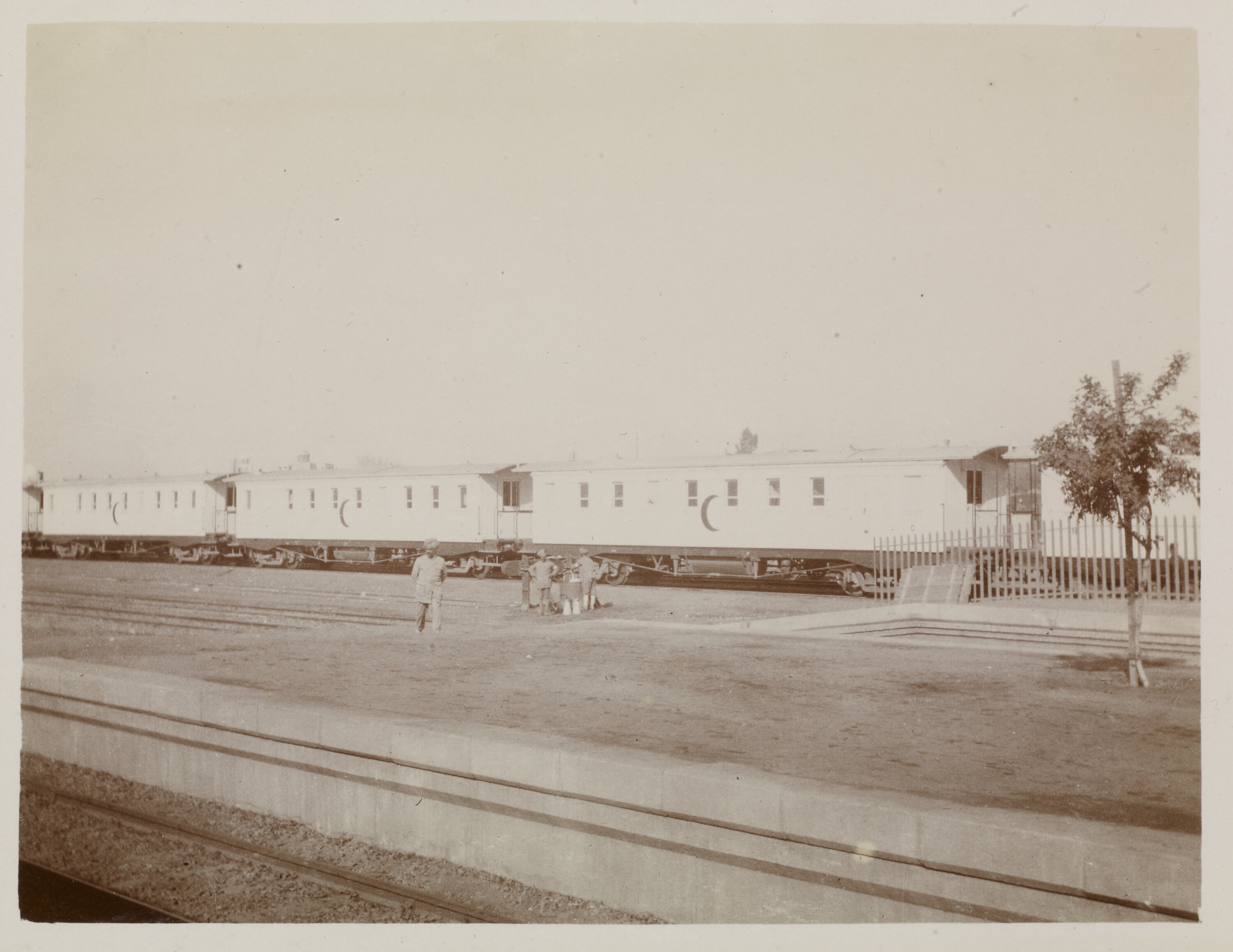 The image features an Egyptian hospital train, standing stationary at the train station. Three of the train carriages are visible in the photograph, with each of the carriages displaying a painted half crescent moon. Standing in front of the train are three Arabic men, all wearing turbans.