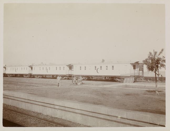 Hand written in ink underneath the photograph: 'Hospital train Zagazig' Hand written in ink on the back of the photograph: 'Hospital Train / Zagazig'