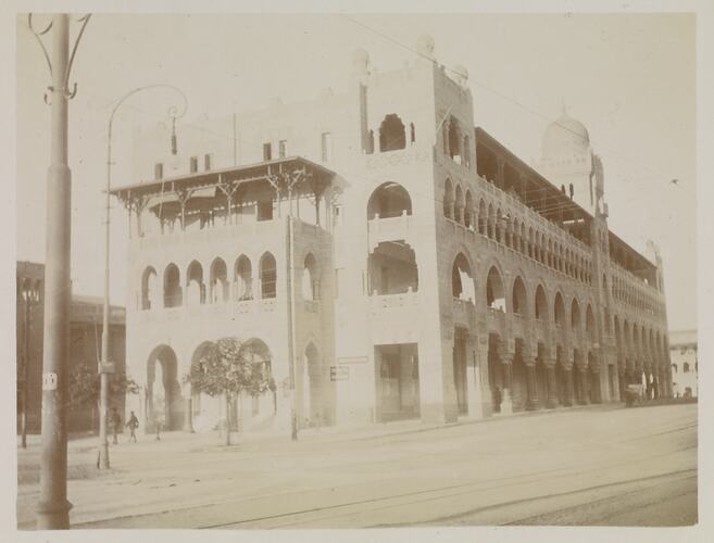 The modern suburb of Heliopolis was developed in 1905 by the Heliopolis Oasis Company as an upscale district in north-eastern Cairo. According to the written inscription on the back, the postcard shows the 'electric cars' that ran between Cairo and Heliopolis.