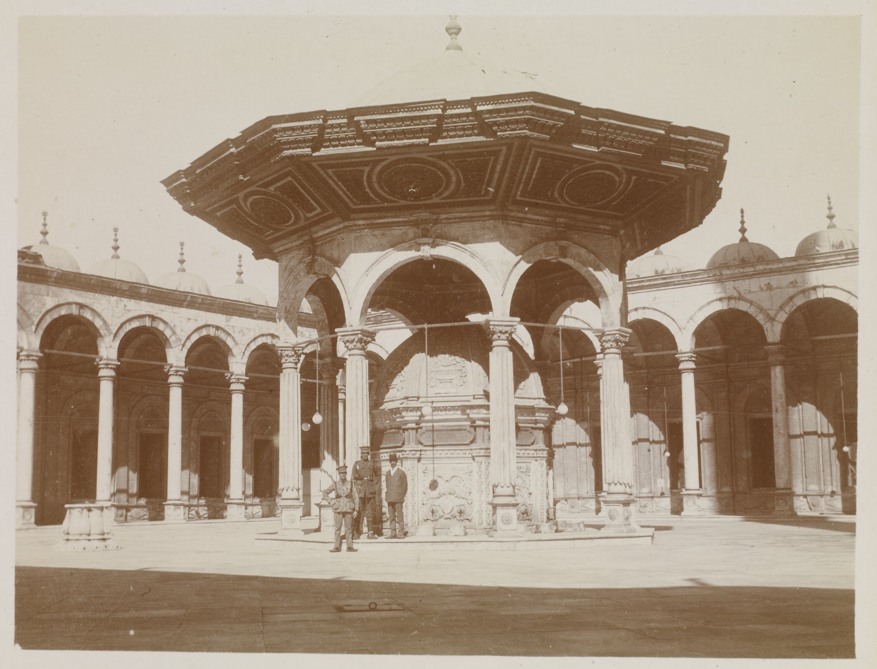 The photograph shows the ablution fountain that is located outside the Mosque at the Cairo Citadel. Three men are posing in front of the fountain. Two of the men are dressed in military uniforms and the third is dressed in a suit, tie and hat.