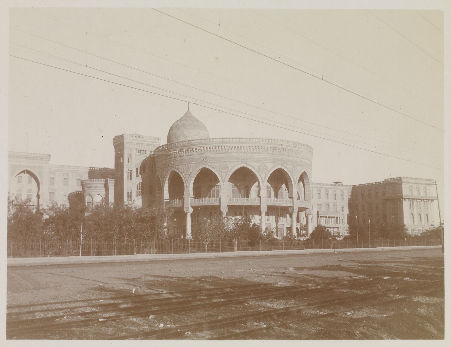 Exterior view of the Heliopolis Palace Hotel. A large cylandrical building fronts the Hotel and just behind it a dome is visible. In the foreground of the photograph, in front of the building, a series of train tracks run along the ground.