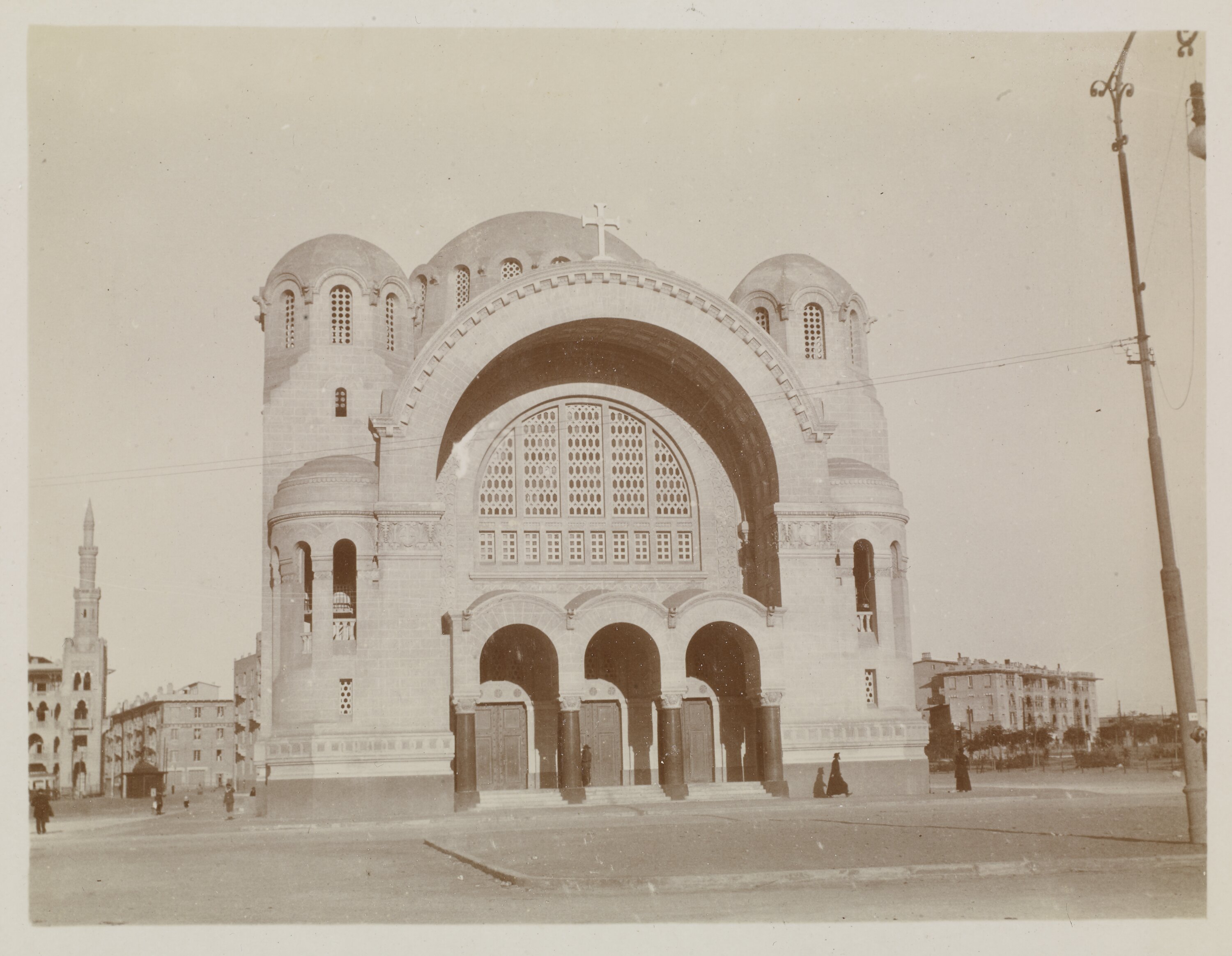 The photograph shows the Church at Heliopolis. The Church stands rather isolated from other buildings on the street. The front facade consists of one large arch and three smaller arches within the main arch. There are a few people walking around the exterior of the Church and one man who appears to be entering the Church.
