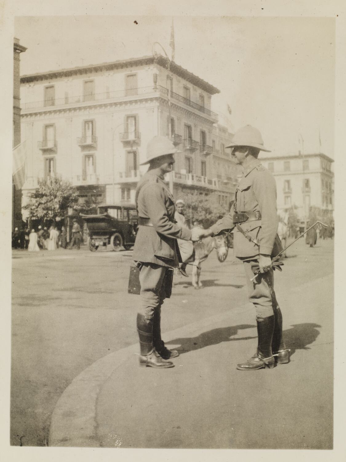 Image of Major McNicholl and Captain Finlayson meeting in Cairo. Major Walter Ramsey McNicholl was assigned to the Headquarters of the 7th Battalion. He returned to Australia in 1918. Captain Christopher Finlayson was also assigned to the Headquarters of the 7th Battalion. He was wounded in early April 1915 and returned to Australia in 1916.