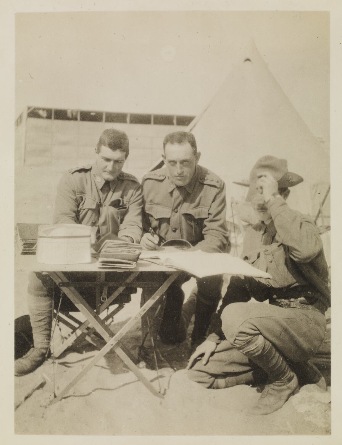 The photograph shows three unformed men, one sitting, one kneeling and one squatting, outside around a small wooden table. The man on the left of the photo is staring at the table, and appears to be writing in a book. The man in the middle is staring directly at the camera, with his pen poised as though he was halfway through writing something. The man on the right of the photo is staring at the book on the table. His hand is holding onto his hat and as a result is covering his face. In the immediate background a tent and some kind of building is visible.