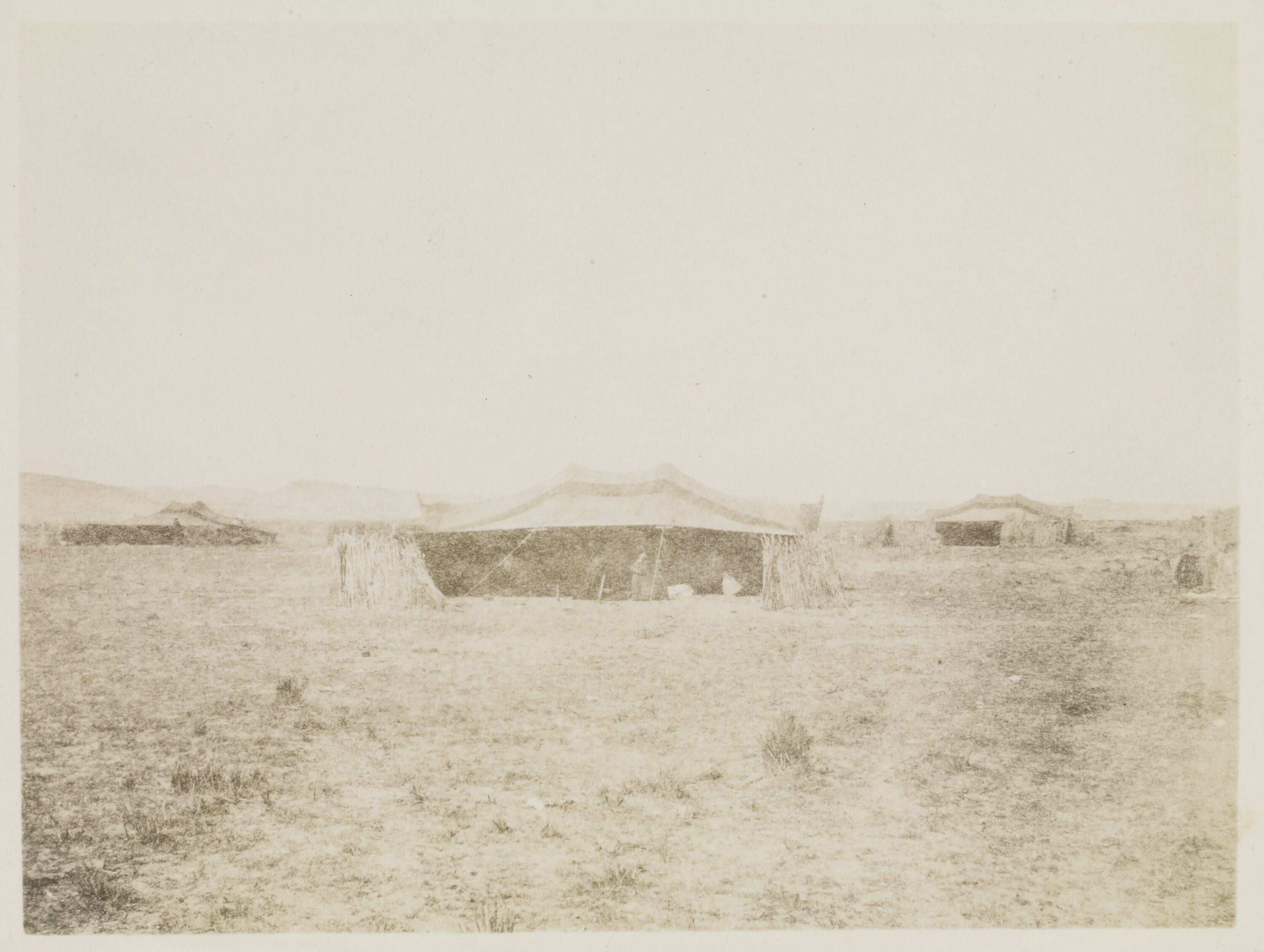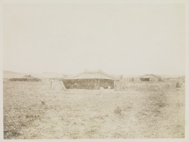 Image of a Bedouin camp. According to the inscription this image was taken on the trip Captains McCrae, McKenna and Mason and Lieutenants Chapman, De Ravin and Scanlan took to 'Sakara.' Also according to the inscription, thirty men, women and children live in each tent like the one depicted.