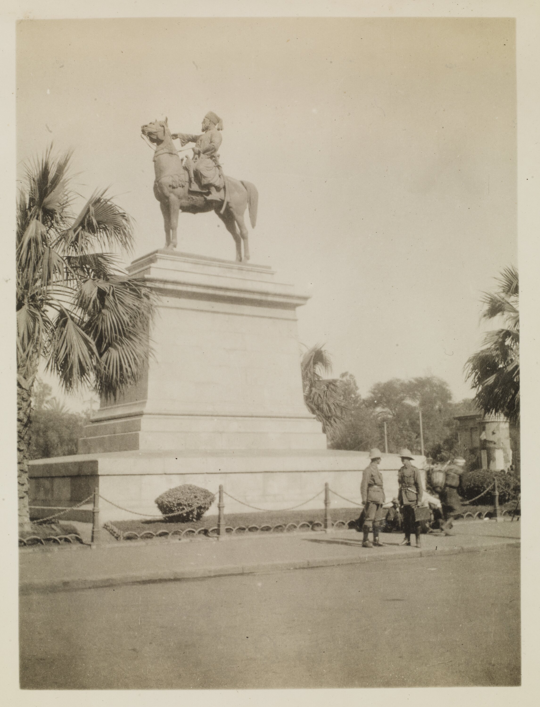 The photograph shows a large statue of a military figure on a horse known as the Equestrian Statue of Viceroy Ibrahim Pasha.In front of the statue two British soldiers in full uniform stand talking to each other. Surrounding the statue are a few palm trees and manicured gardens.