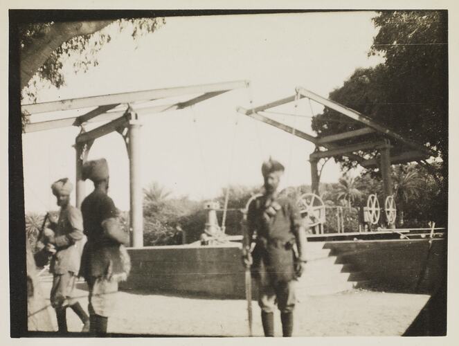 Photograph shows three Indian servicemen standing around what looks like a well.