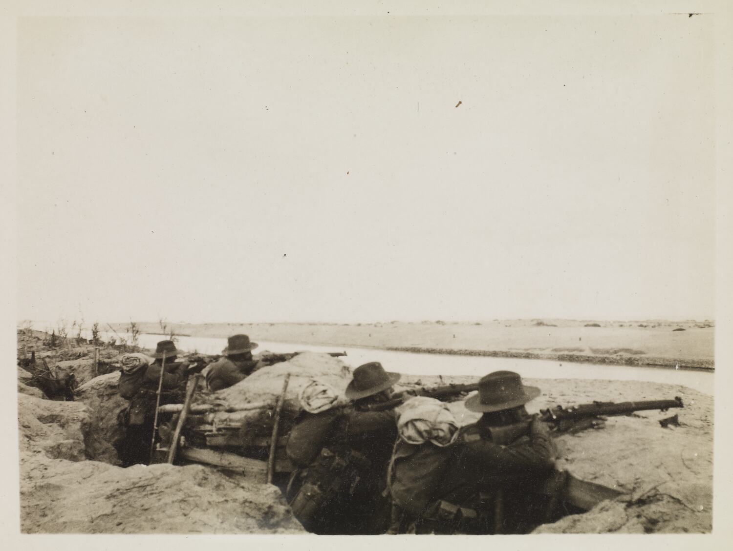Four Australian soldiers in a trench up to their shoulders, aiming guns at an unknown target across the other side of the river. Each of the men are wearing packs and hats. The river that separates the soldiers and their target stretches into the distance. The opposite side of the river consists of a flat, sandy landscape.