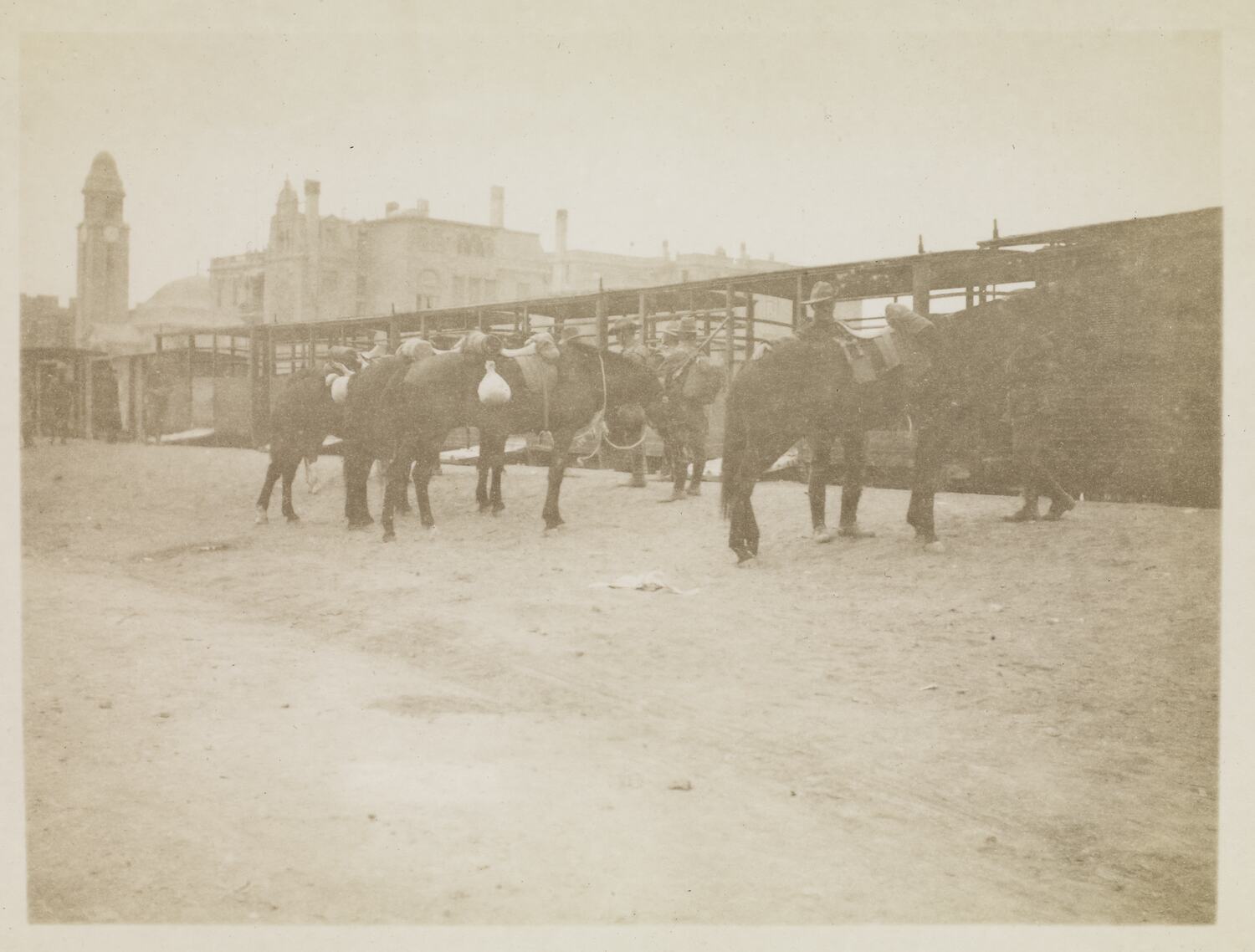 A group of five saddled horses, facing away from the photographer, and standing close by a group of five Australian soldiers. One of the soldiers appears to be placing items in a horses saddlebag while the other men are standing nearby. Behind the horses a train carriage, broken up into individual stables, stands stationary. Each of the stables has an open gate and a small walkway leading from the ground onto the train carriage. In the background beyond the train, a clock tower and group of buildings are visible.