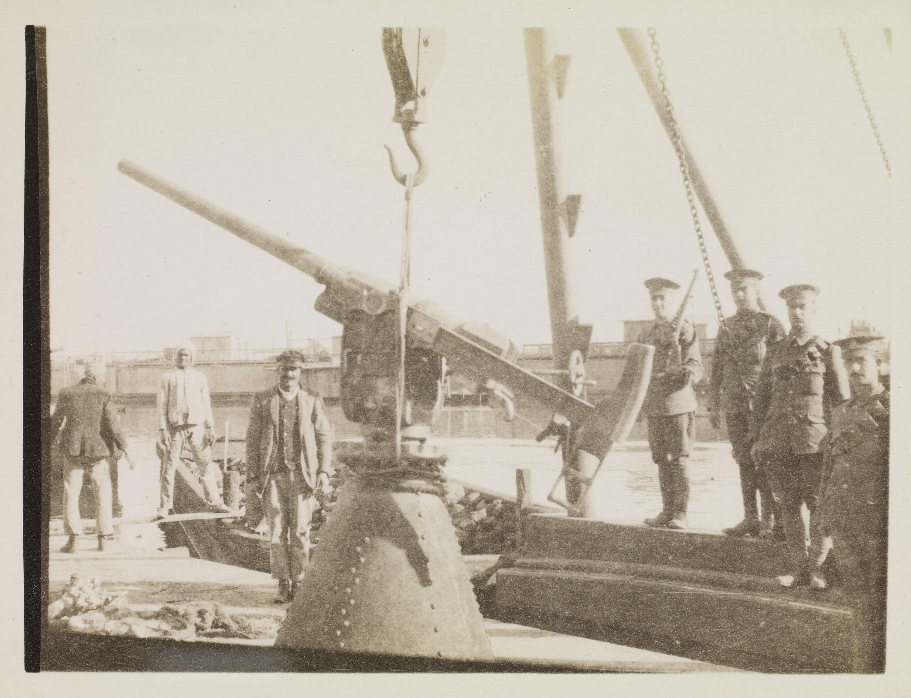 A large twelve pound gun either being off loaded or loaded onto a dredge on the canal. Four uniformed British soldiers stand to the right of the gun, posing for the camera. To the left of the gun another three men stand, possible all local Egyptians. Behind the dredge the men are standing on, other boats and dredges are visible sitting stationary on the canal.