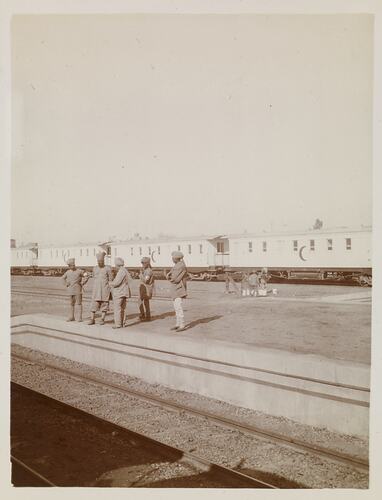 Image of Indian troops standing on railway station at Zagazig (El-Zakazik) with a hospital train in the background.