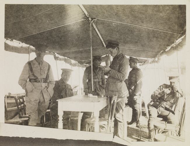Image of a group of servicemen on board the steamer used for the trip to the Barage (or 'barrage' meaning an unspecified dam). Majors Blizzard and Jackson, Lieutenants Stewart and Scanlan and Captains McKenna, McCrae and Hunter are shown in the image. McKenna is second from left.