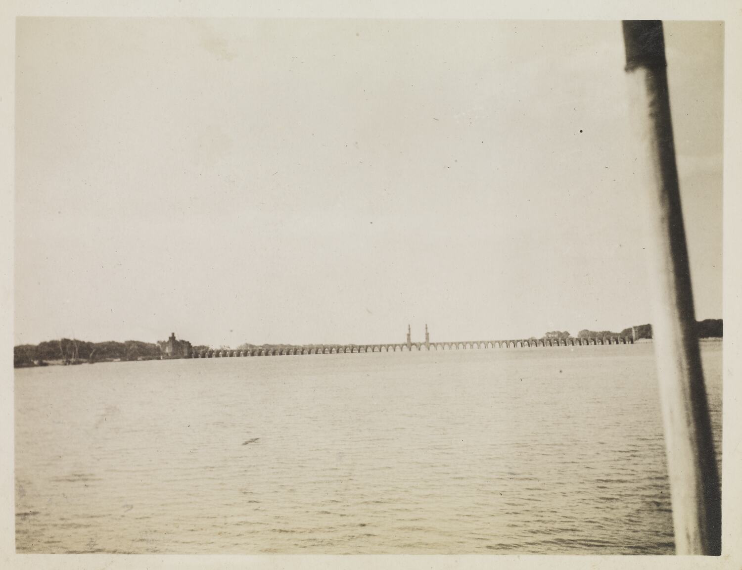 Hand-written in black ink on the support on the left of the image: 'The Barage' Hand-written in pencil on the back of the photograph: 'Barage where the water / distribution is regulated'