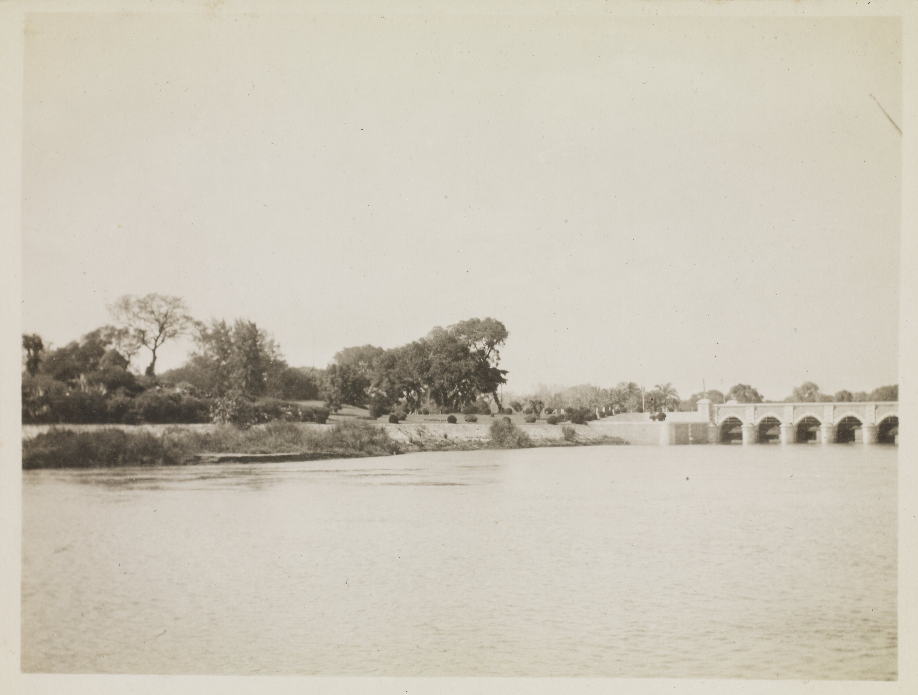 Photograph of the Delta Barrage, showing a nearby garden on the opposite bank to the photographer.