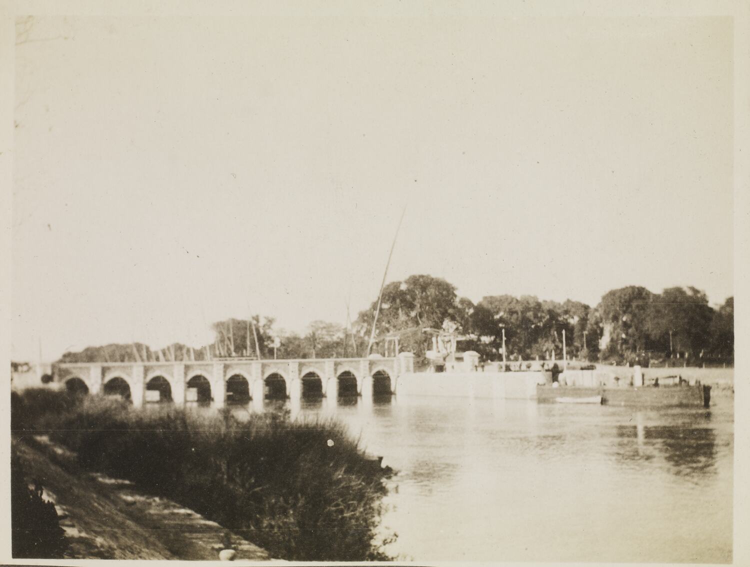 Hand-written in black ink on the support on the left of the image: 'View / of / Barage' Hand-written in black ink on the support on the right of the image: 'Lock / on / Right' Hand-written in pencil on the back of the photograph: 'At the barage / Lock on right hand / side'