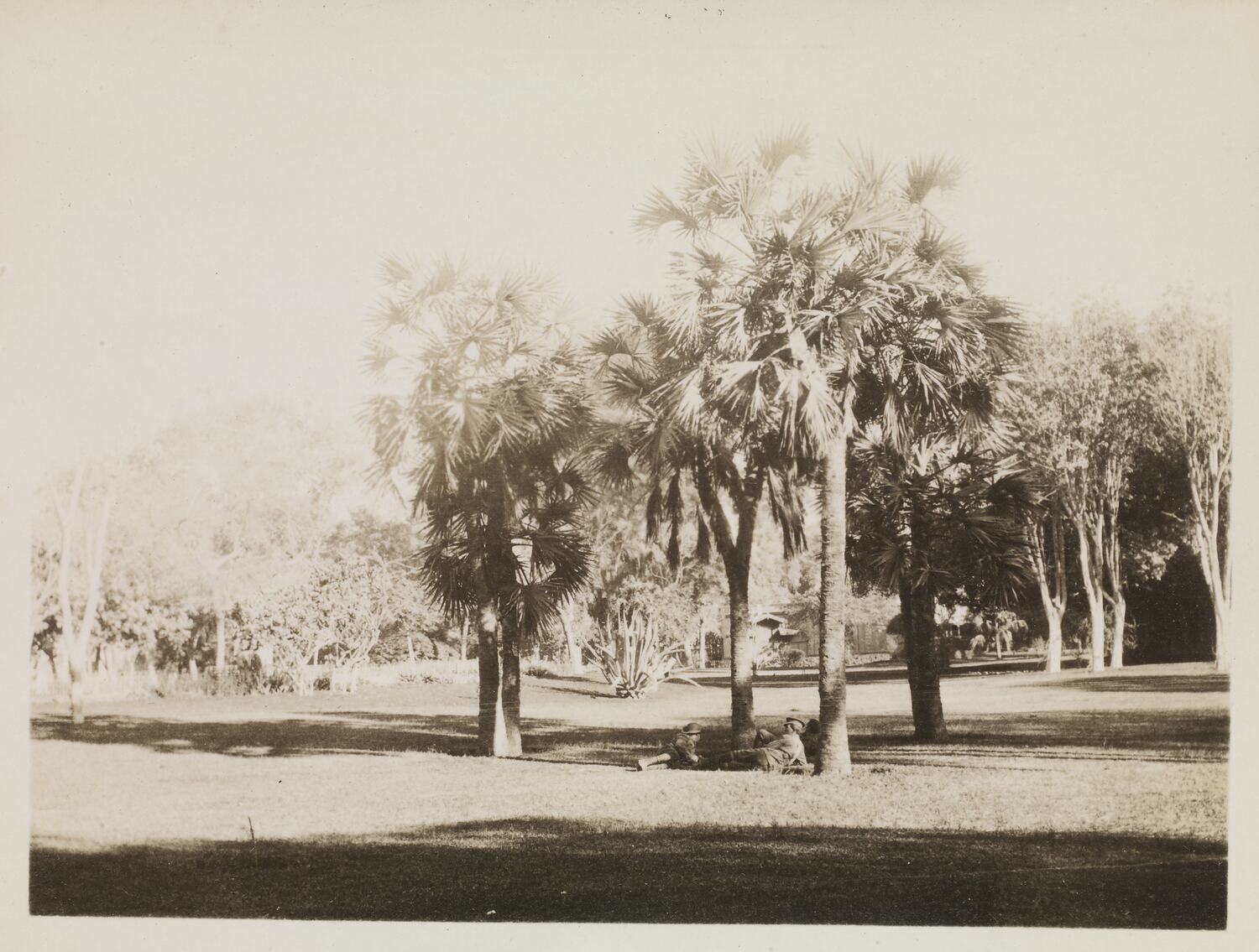 Photograph of landscaped gardens, focusing in particular on a cluster of palm trees under which three servicemen are reclining.