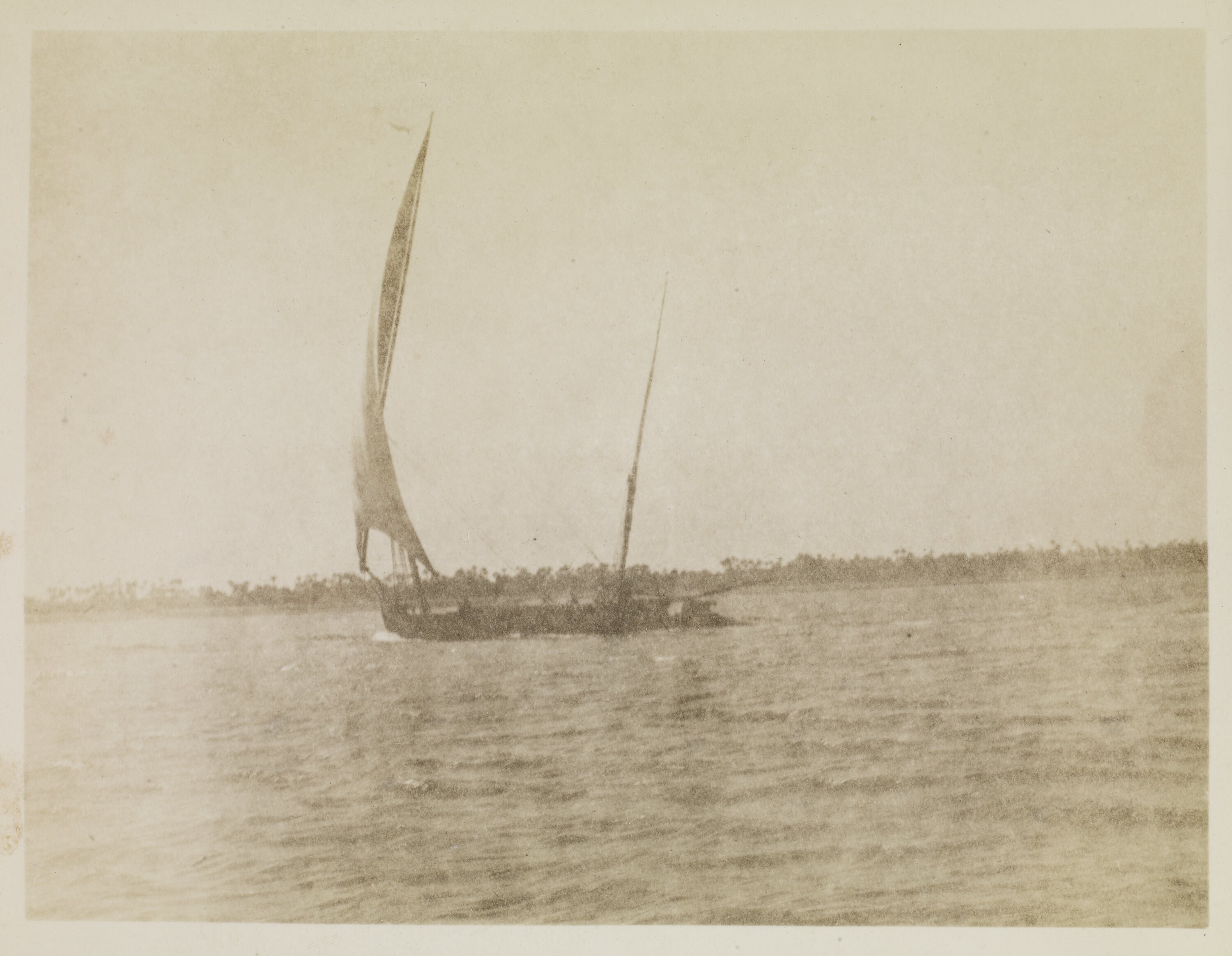 Hand-written in black ink on the support under the image: 'Cargo boats on the Nile' Hand-written in pencil on the back of the photograph: 'Cargo boat on / the nile'