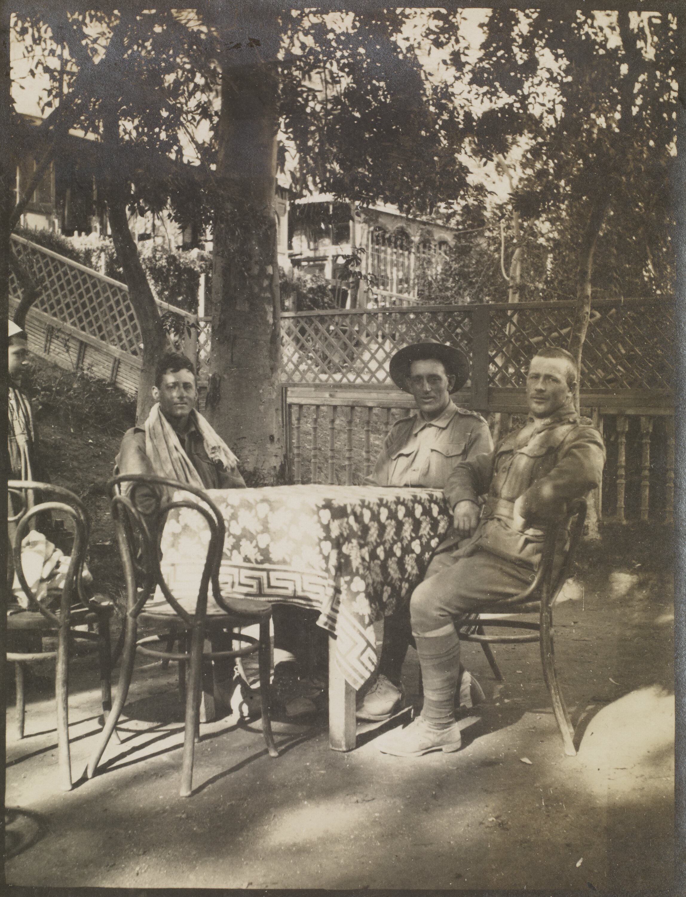 Photograph of Sergeant Hughes, Captain McKenna and Lieutenant Conder sitting in the gardens outside the Shepheards Hotel, taken during World War I, 1914-1915.