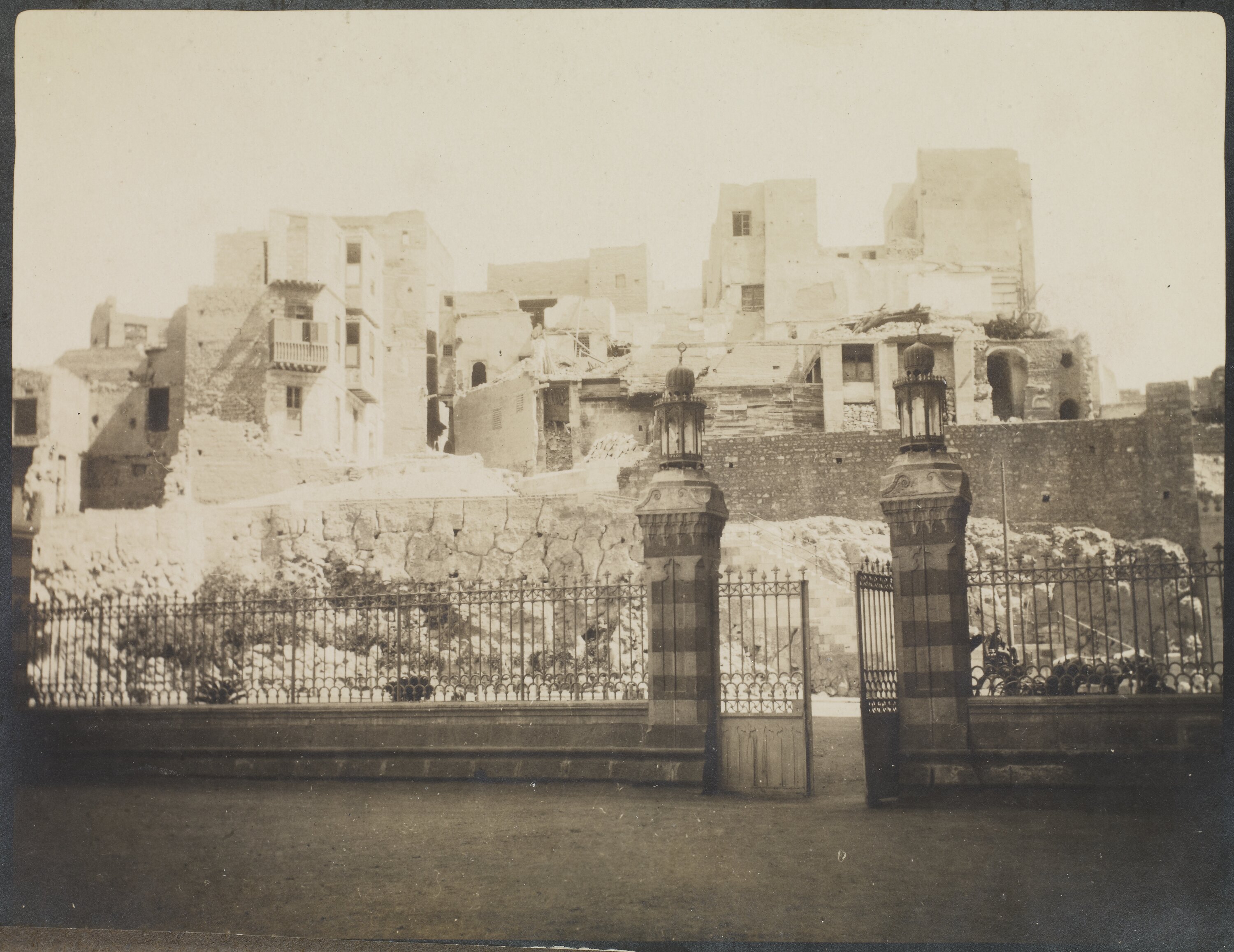 Hand-written in black ink on the support below the image: 'Pulling down old buildings near the / Sultan Hasan Mosque' Hand-written in black ink on the back of the photograph: 'Pulling down old buildings / near Sultan Husana Mosque / they are going to beautify this place / with gardens etc.'