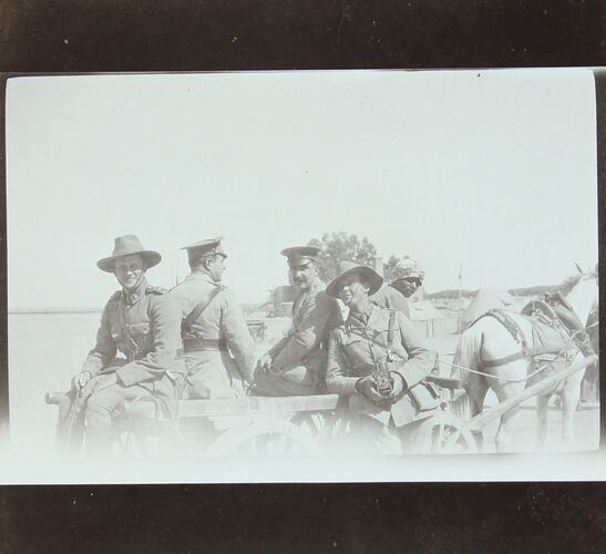 Image of a group of unidentified servicemen on the back of a horse drawn cart at Zagazig (El-Zakazik).